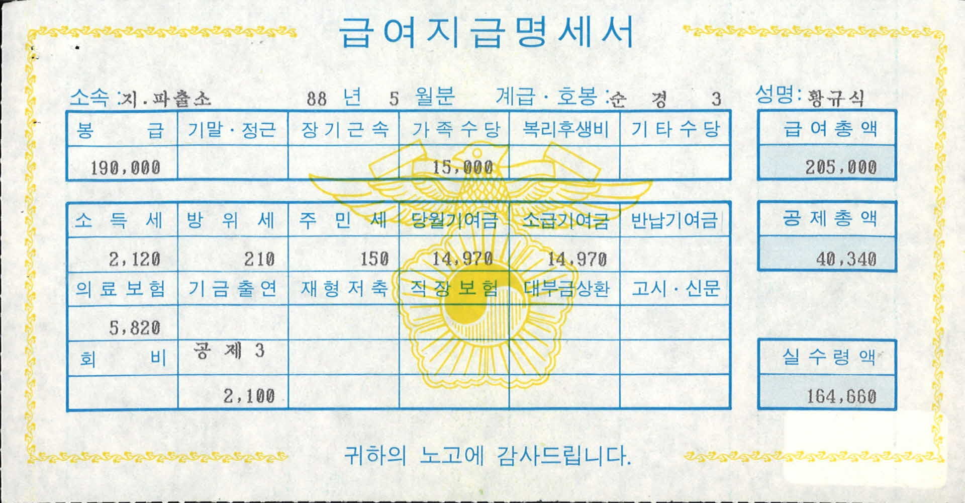 | 기록물명 | 1988년 5월분 순경 급여명세서 | ||