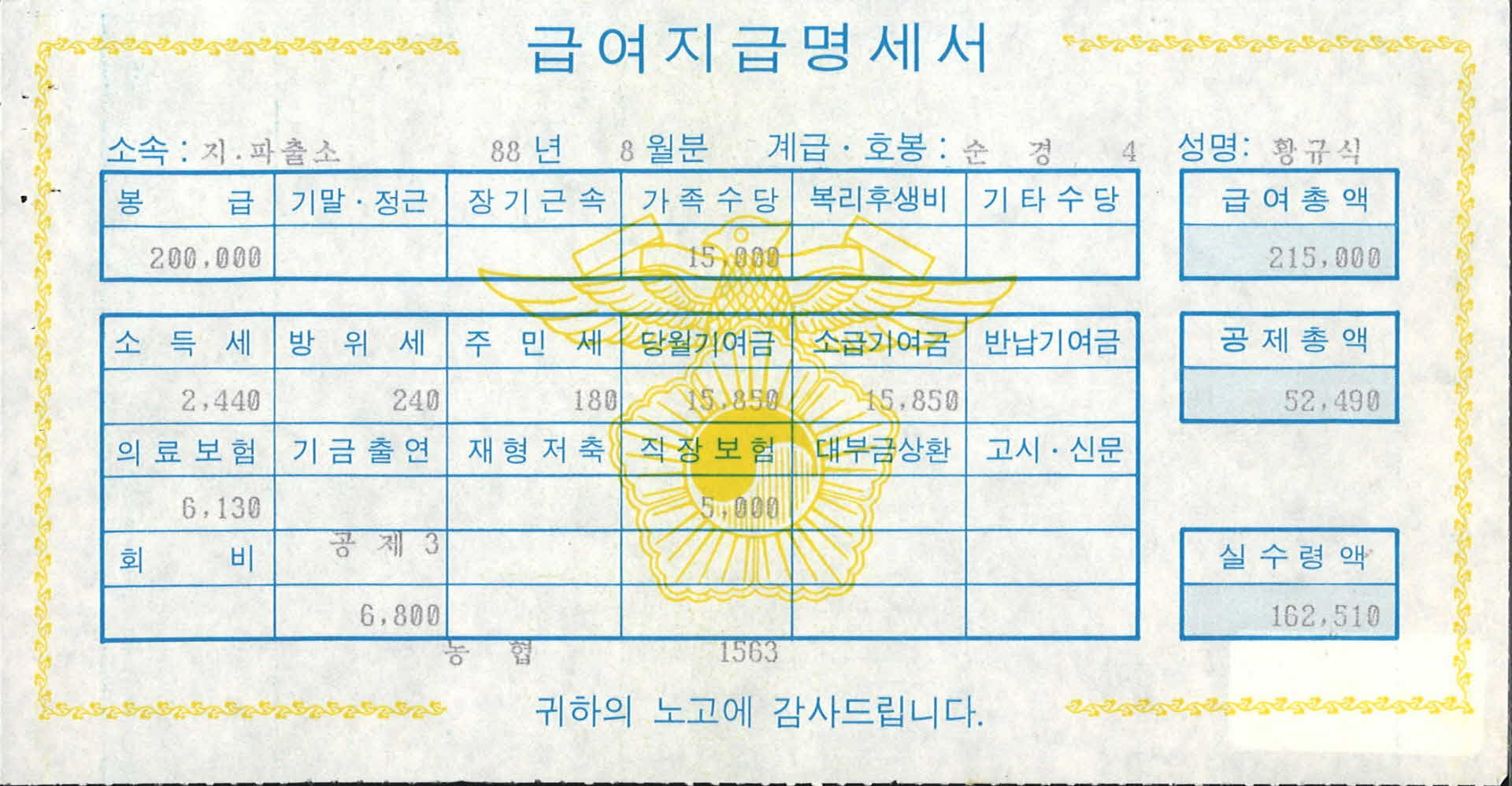 1988년 8월분 순경 급여명세서