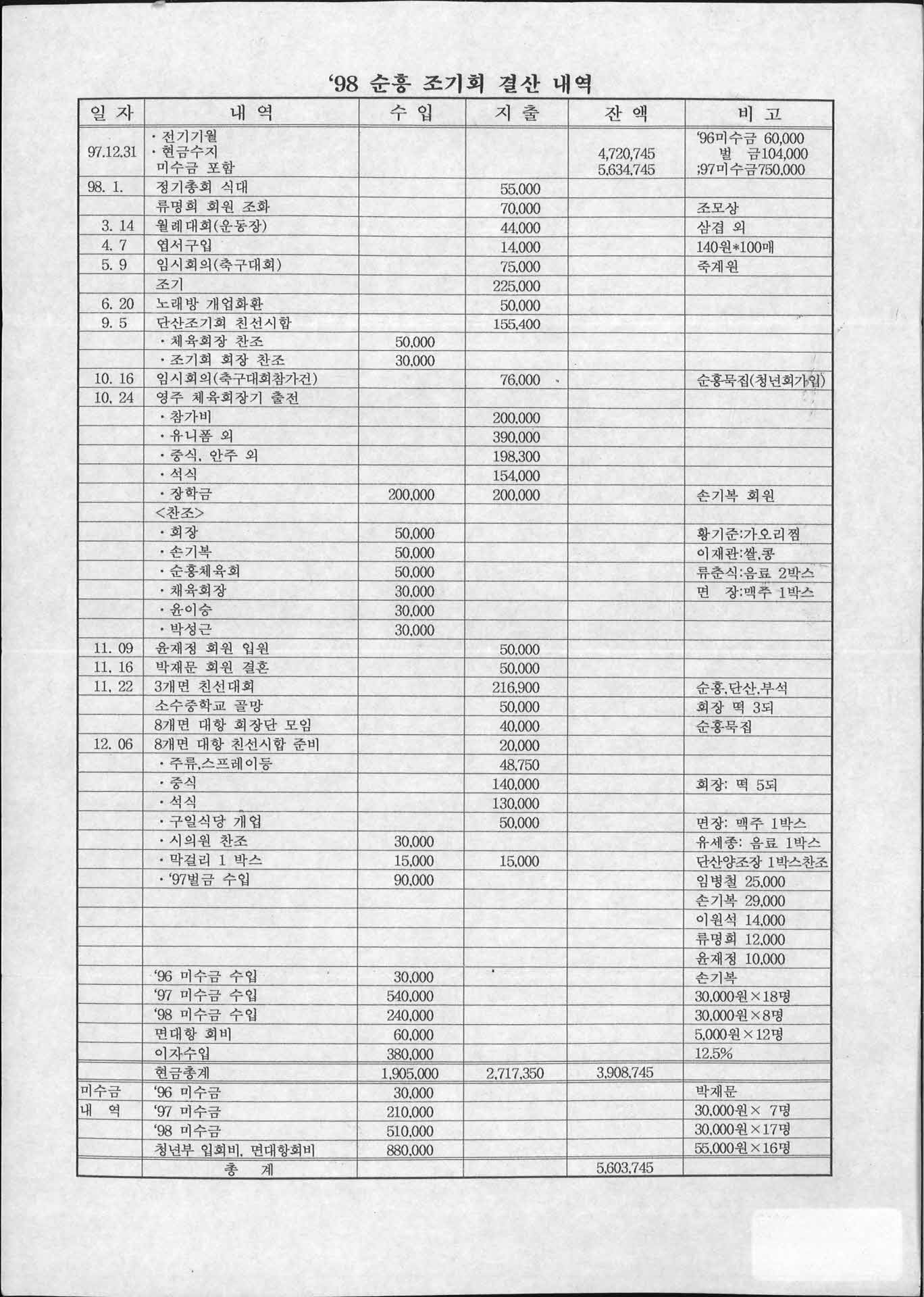 1998년 순흥 조기회 결산 내역