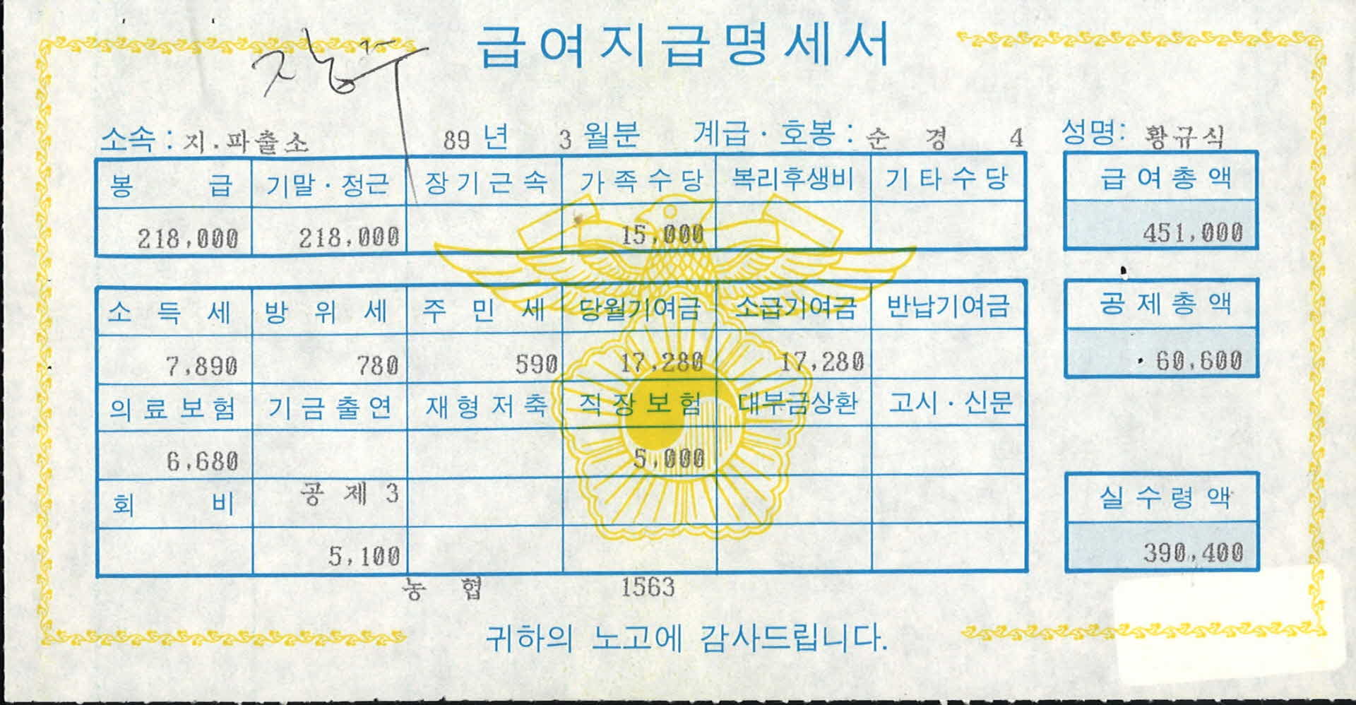 1989년 3월분 순경 급여명세서