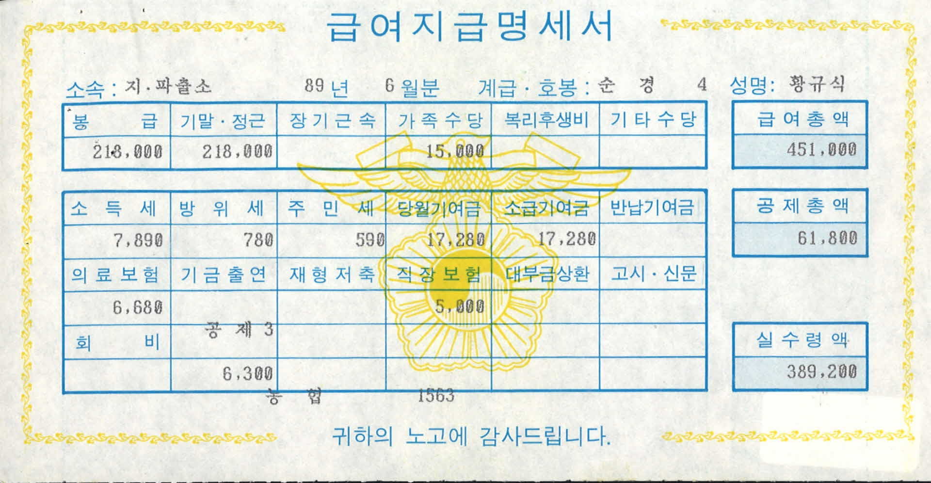 | 기록물명 | 1989년 6월분 순경 급여명세서 | ||