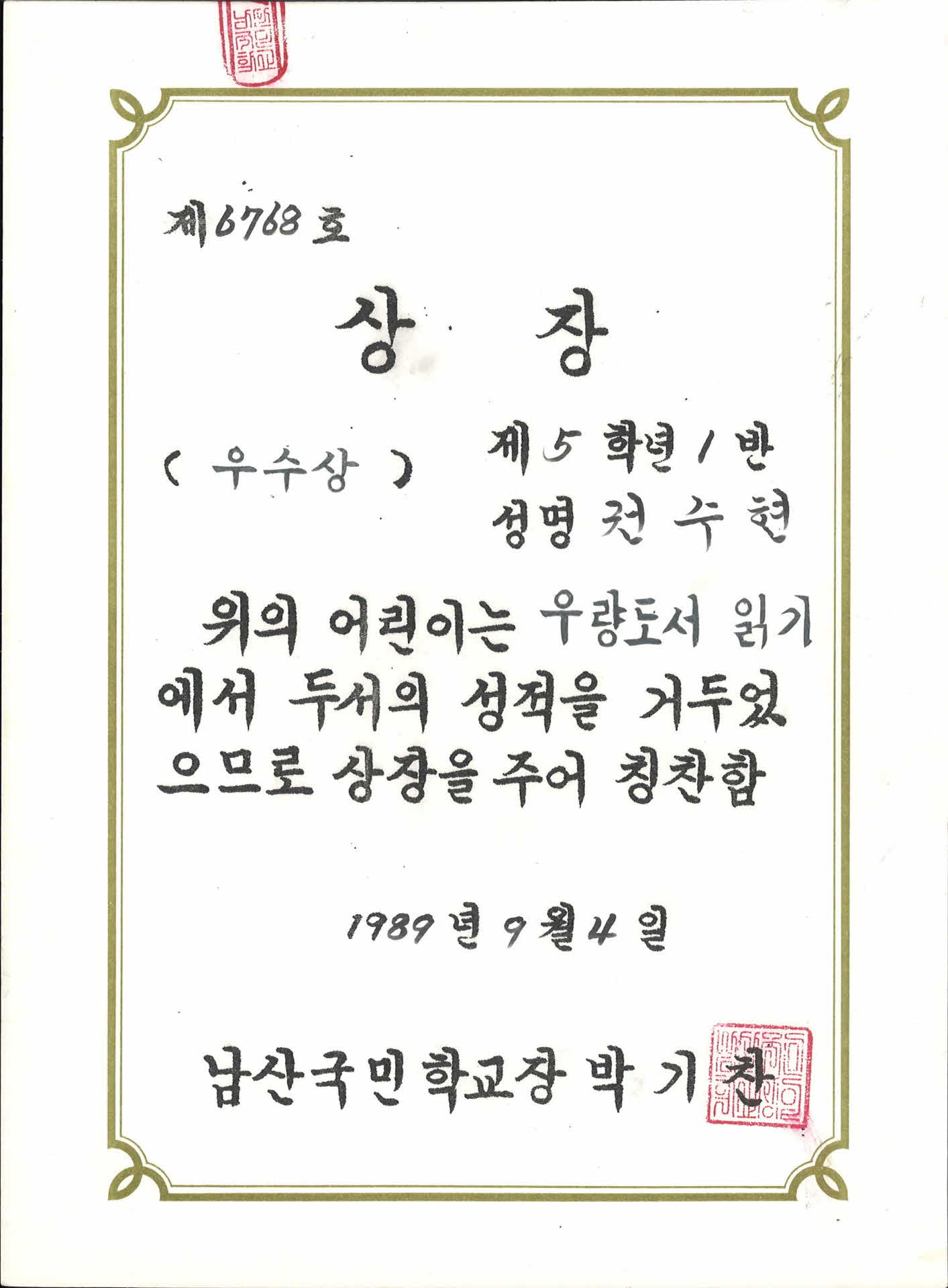 | 기록물명 | 남산국민학교 우량도서읽기 우수 상장 | ||
