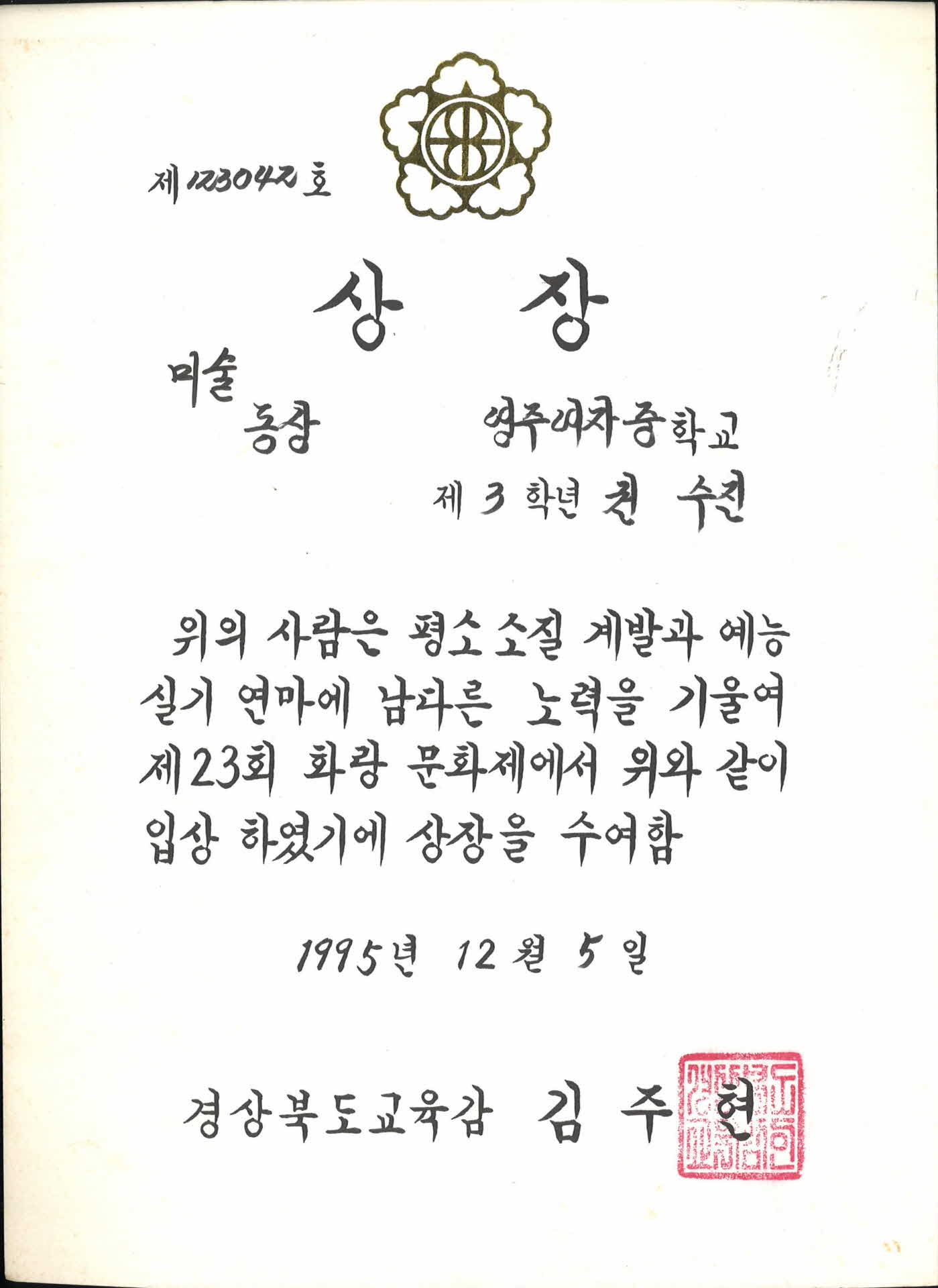 제23회 화랑문화제 미술대회 동상 상장 > 영주, 영주사람