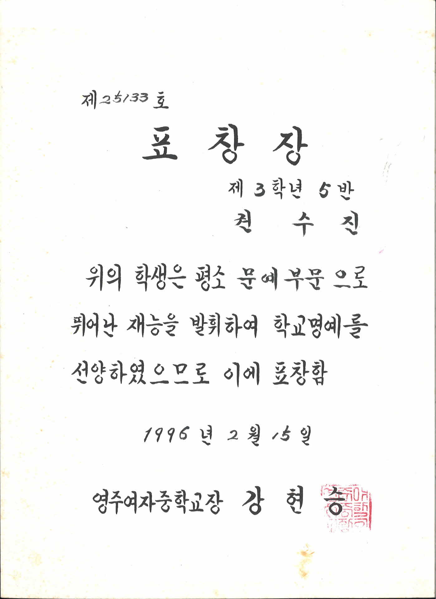 | 기록물명 | 영주여중 문예부문 상장 | ||