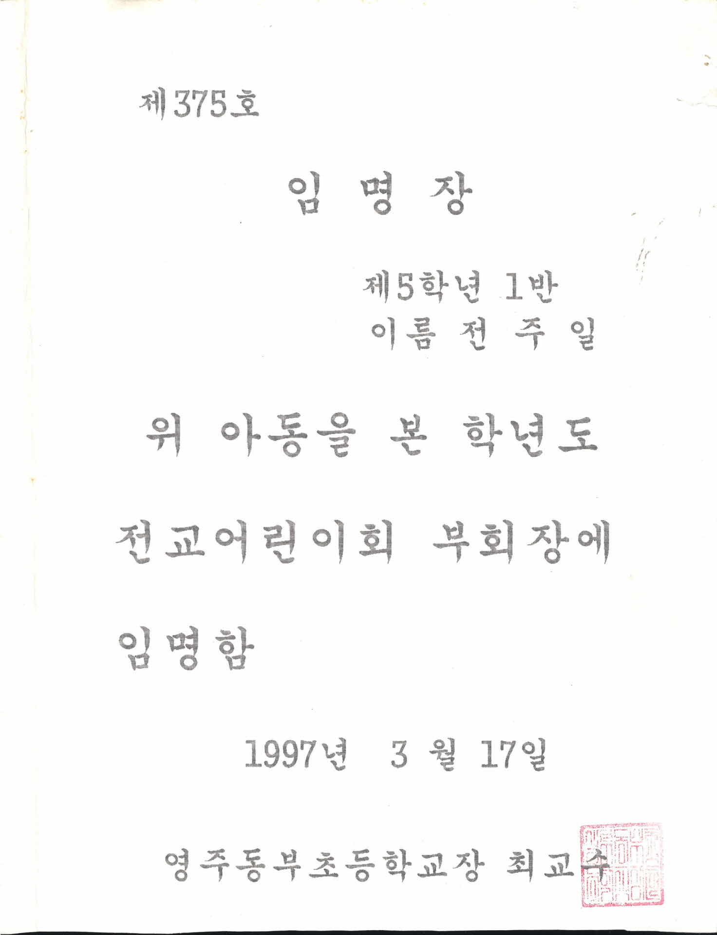| 기록물명 | 영주동부초등학교 전교어린이회 부회장 임명장 | ||