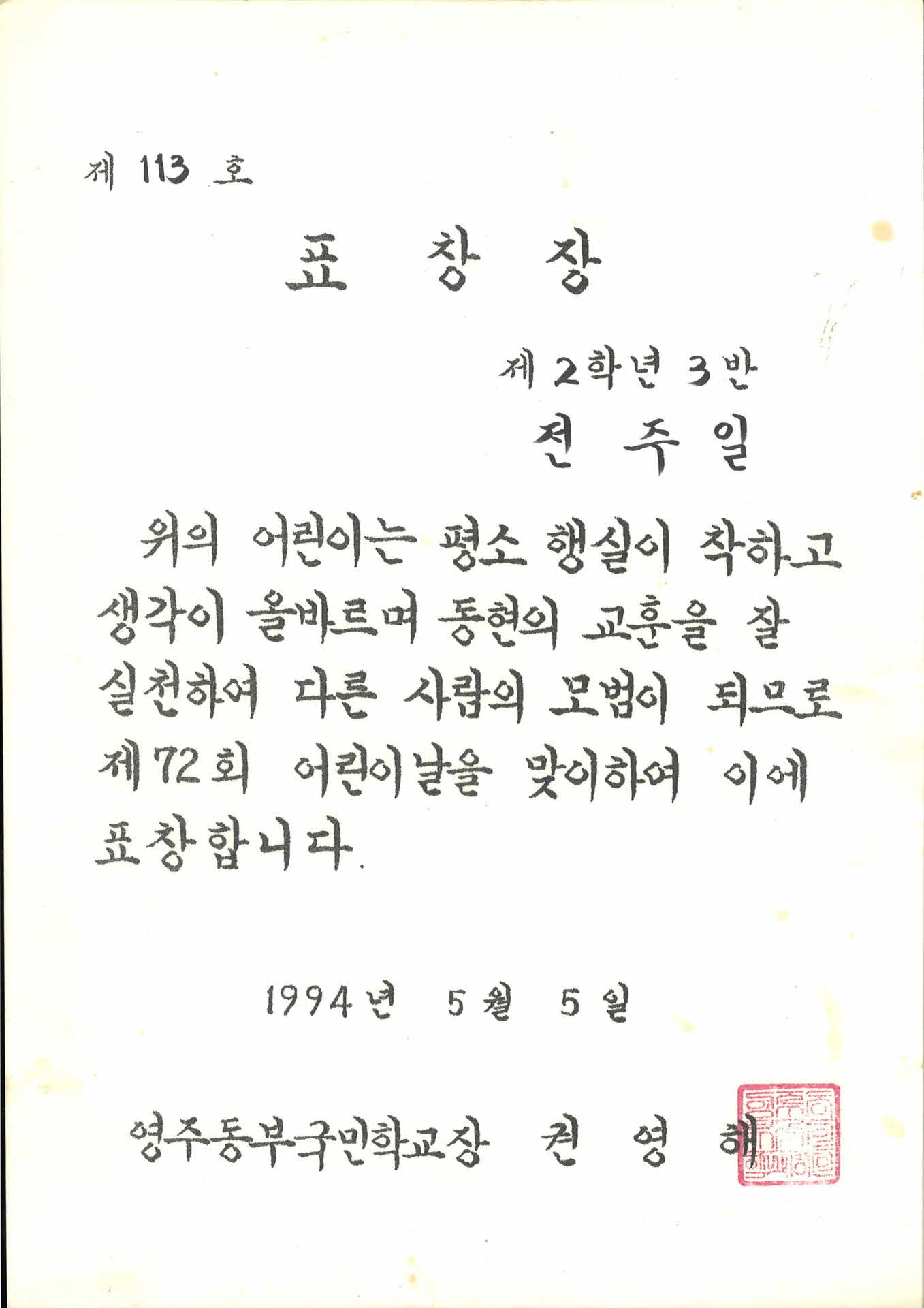 | 기록물명 | 영주동부초등학교 어린이날 표창장 | ||