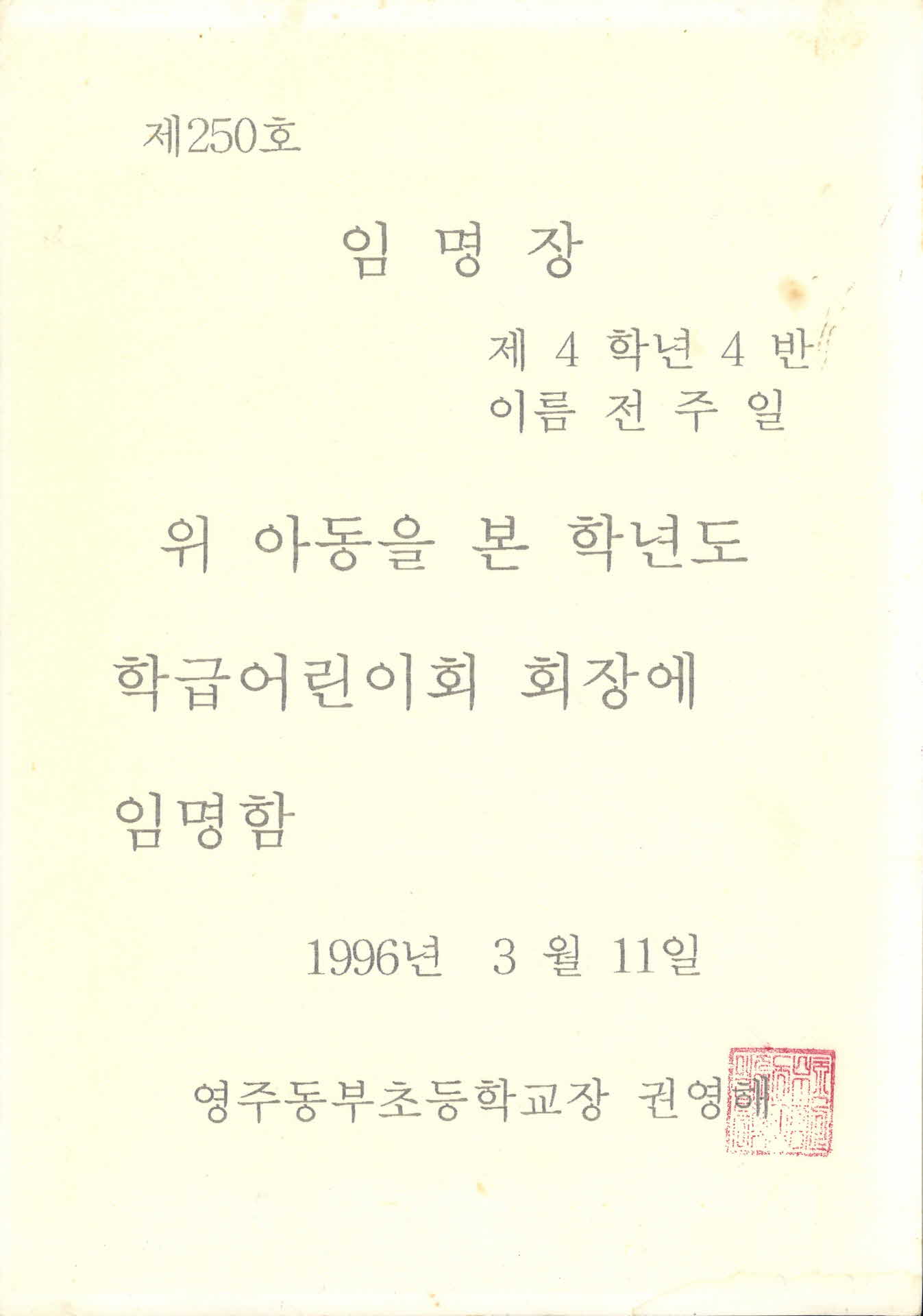 | 기록물명 | 영주동부초등학교 학급어린이회 회장 임명장 | ||
