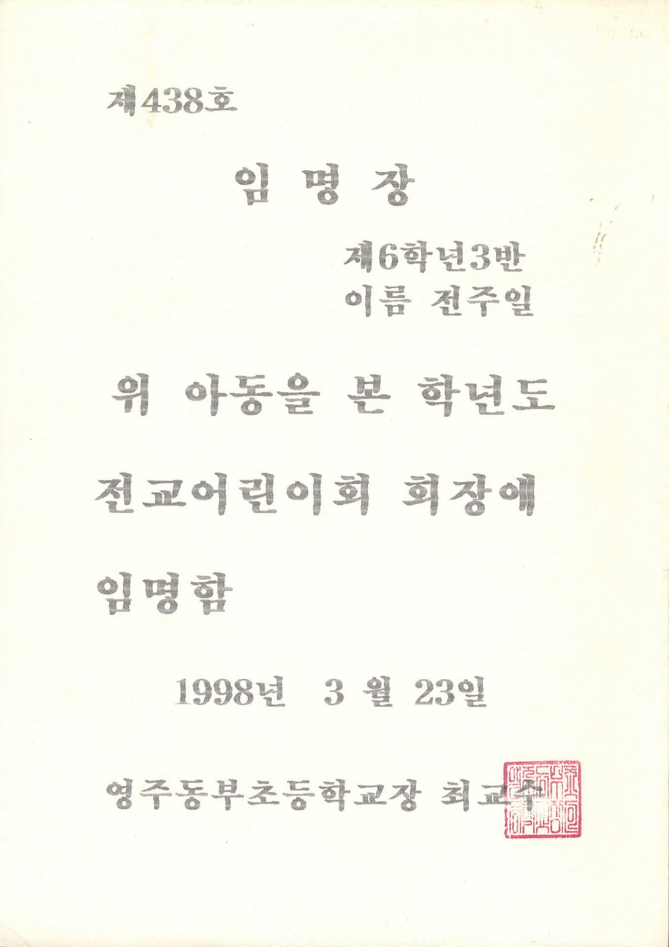 | 기록물명 | 영주동부초등학교 전교어린이회 회장임명장 | ||