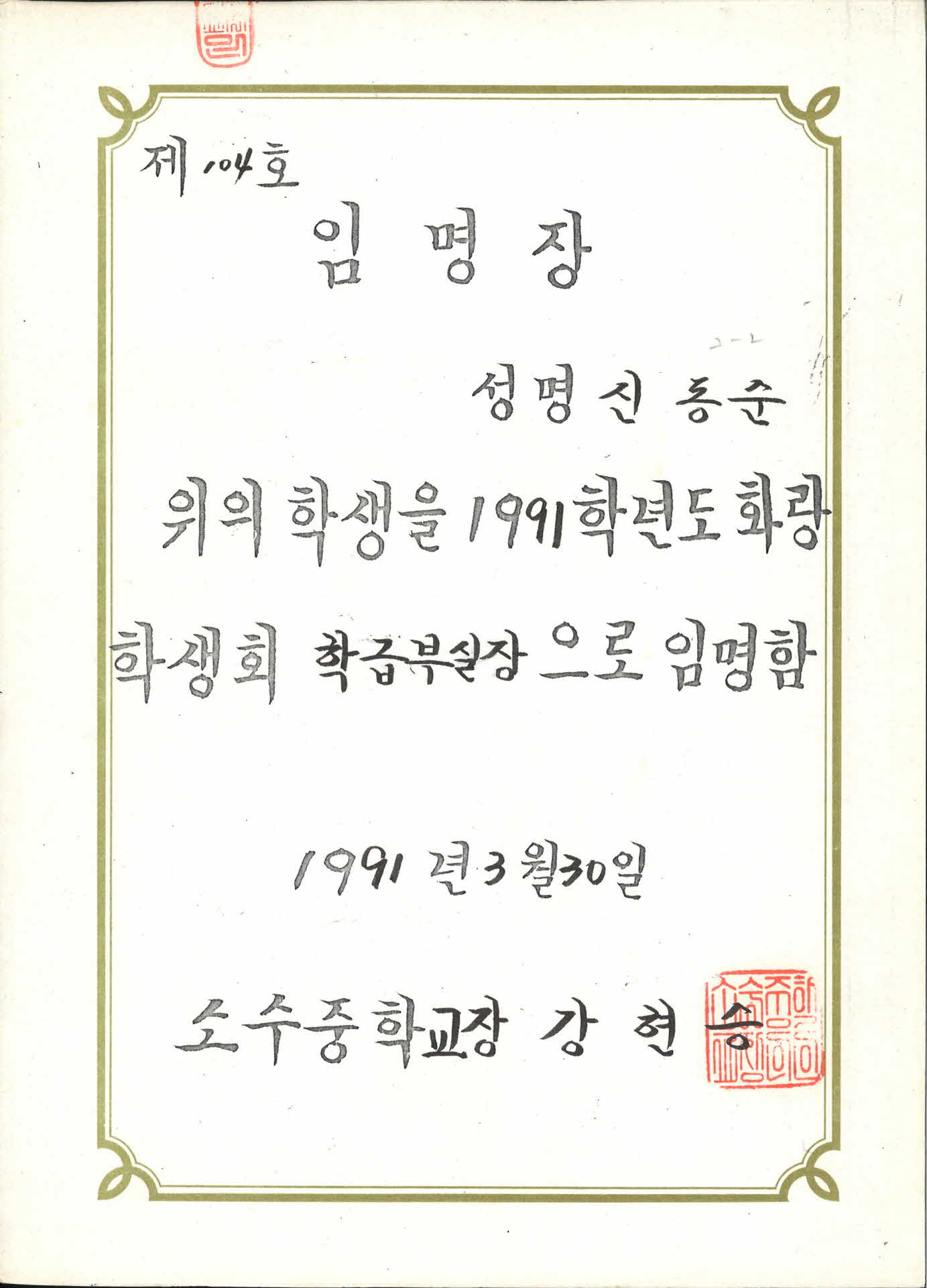 1991년도 소수중학교 임명장