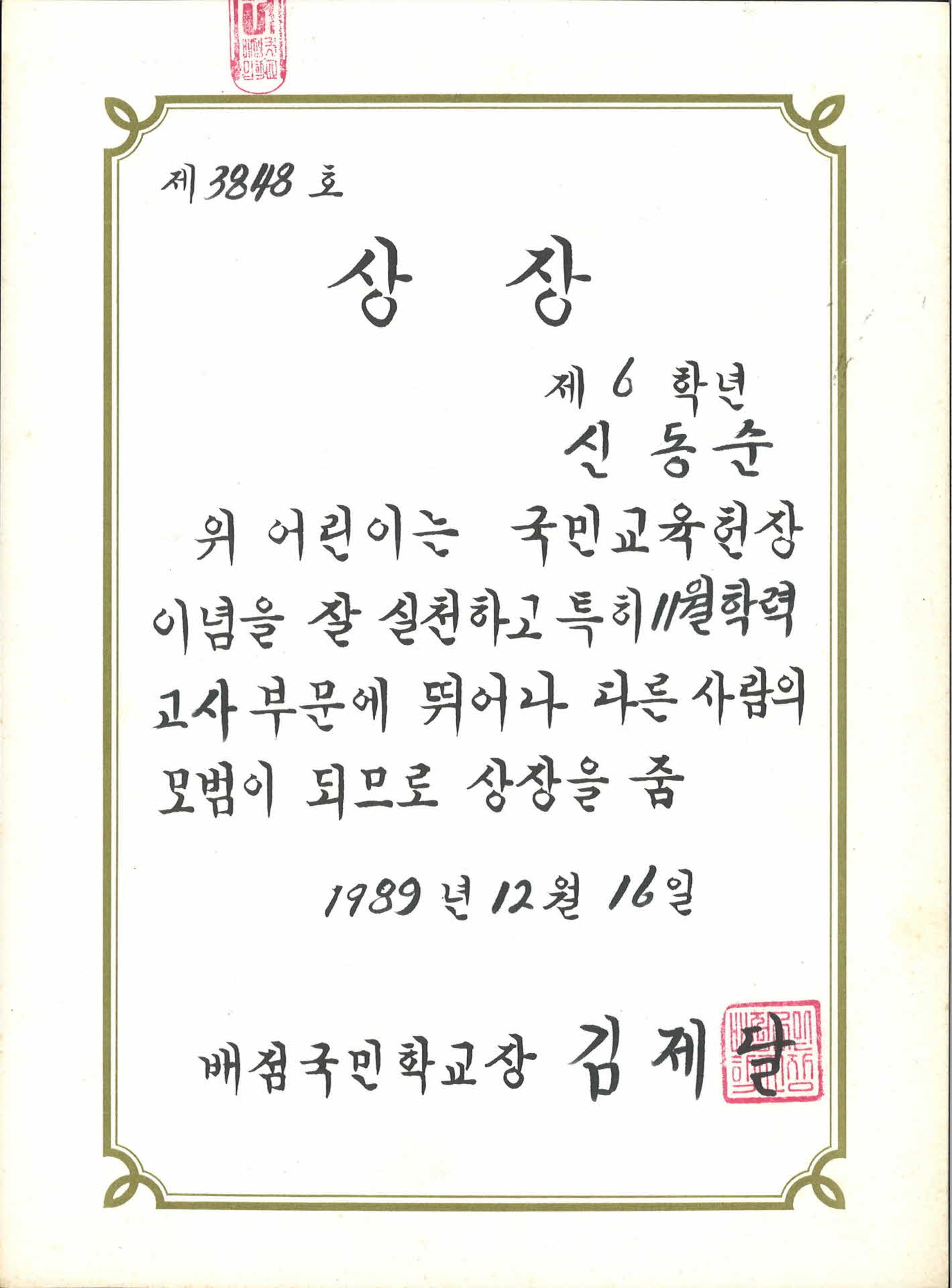 1989년도 배점국민학교 상장