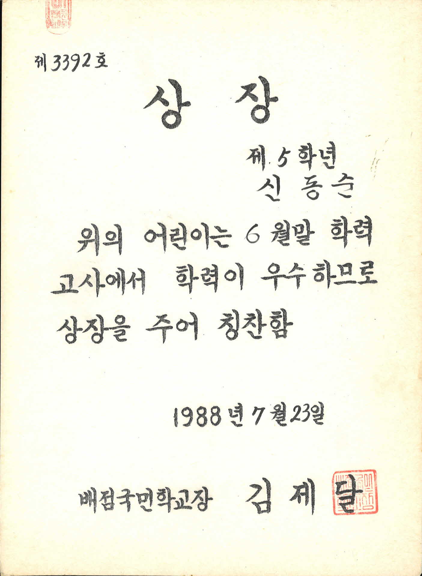| 기록물명 | 1988년도 배점국민학교 상장 | ||