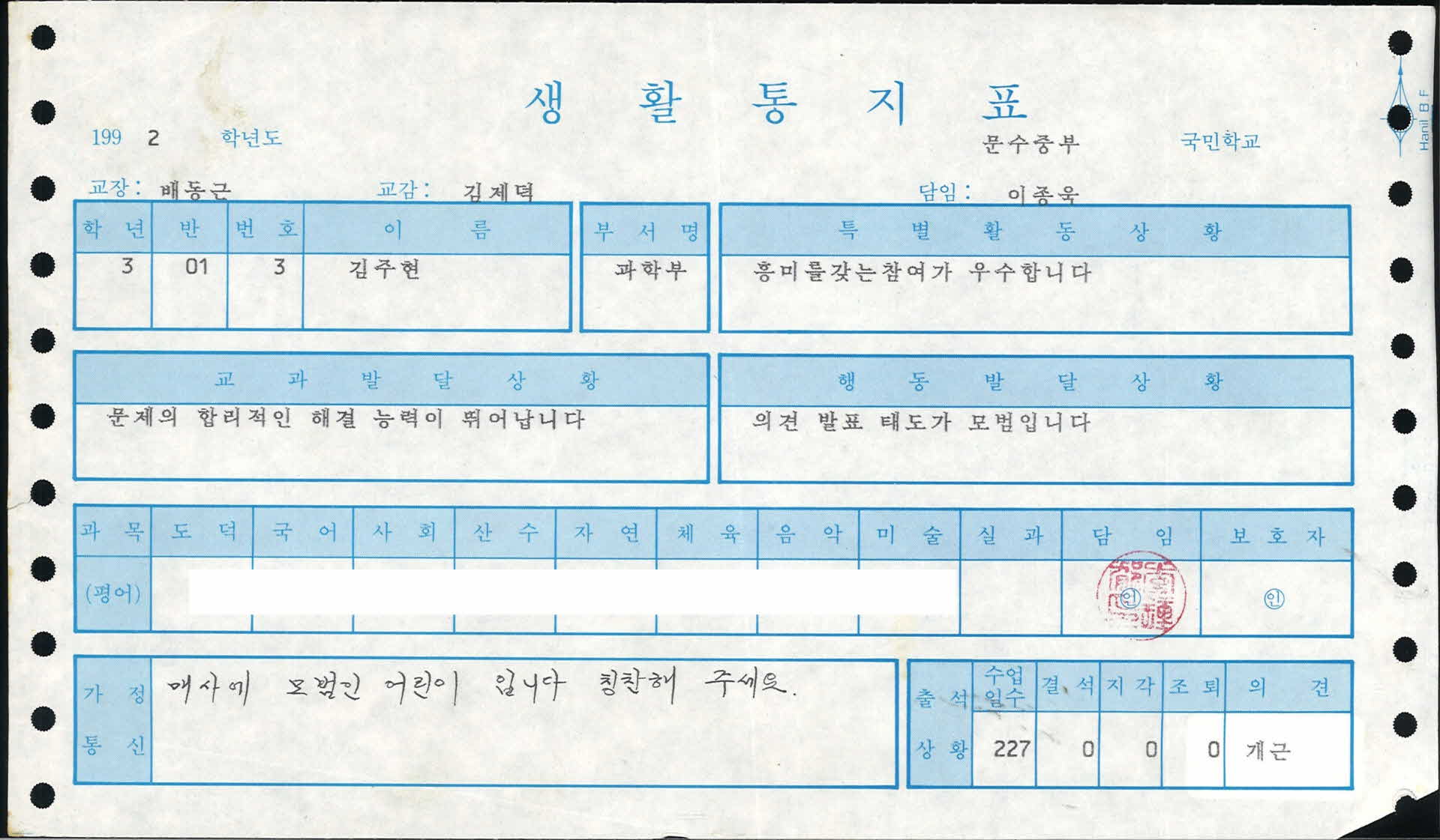 | 기록물명 | 1992년 문수중부국민학교 생활통지표 | ||