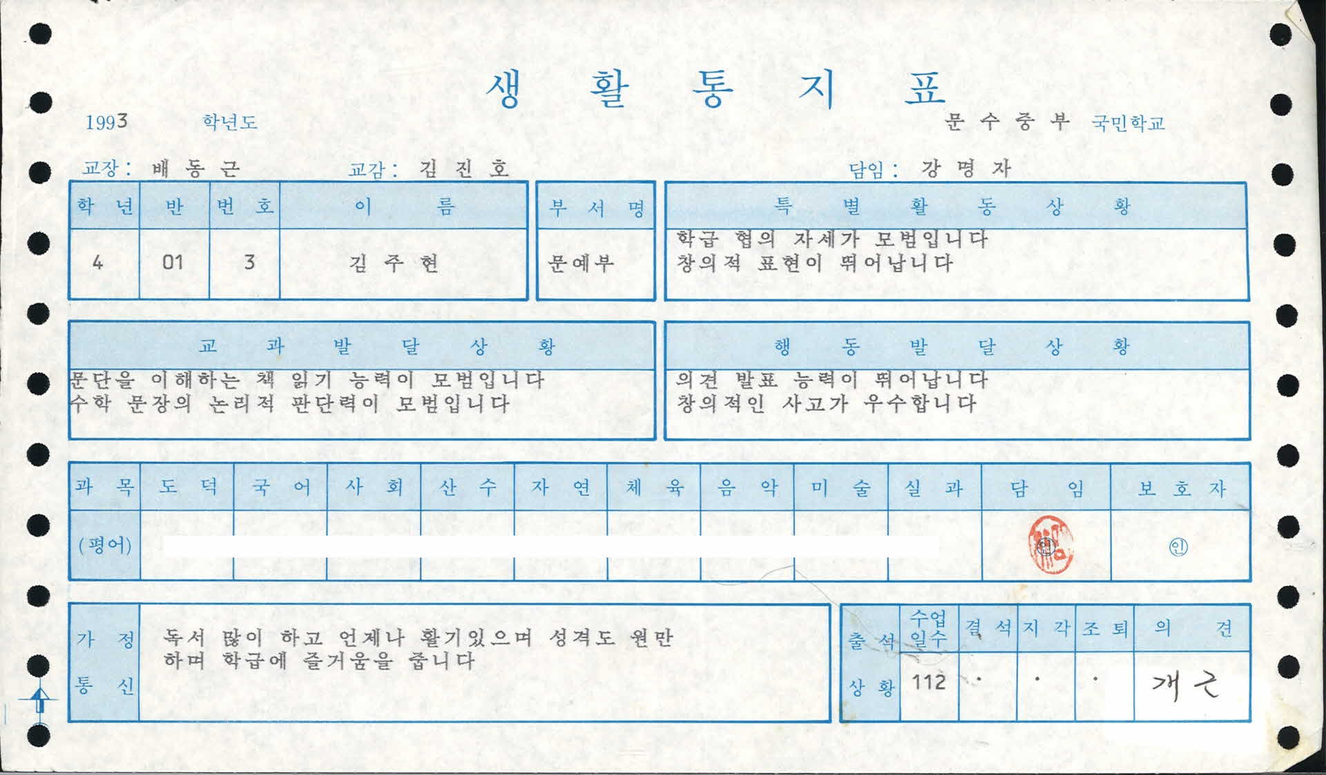 1993년 문수중부국민학교 생활통지표