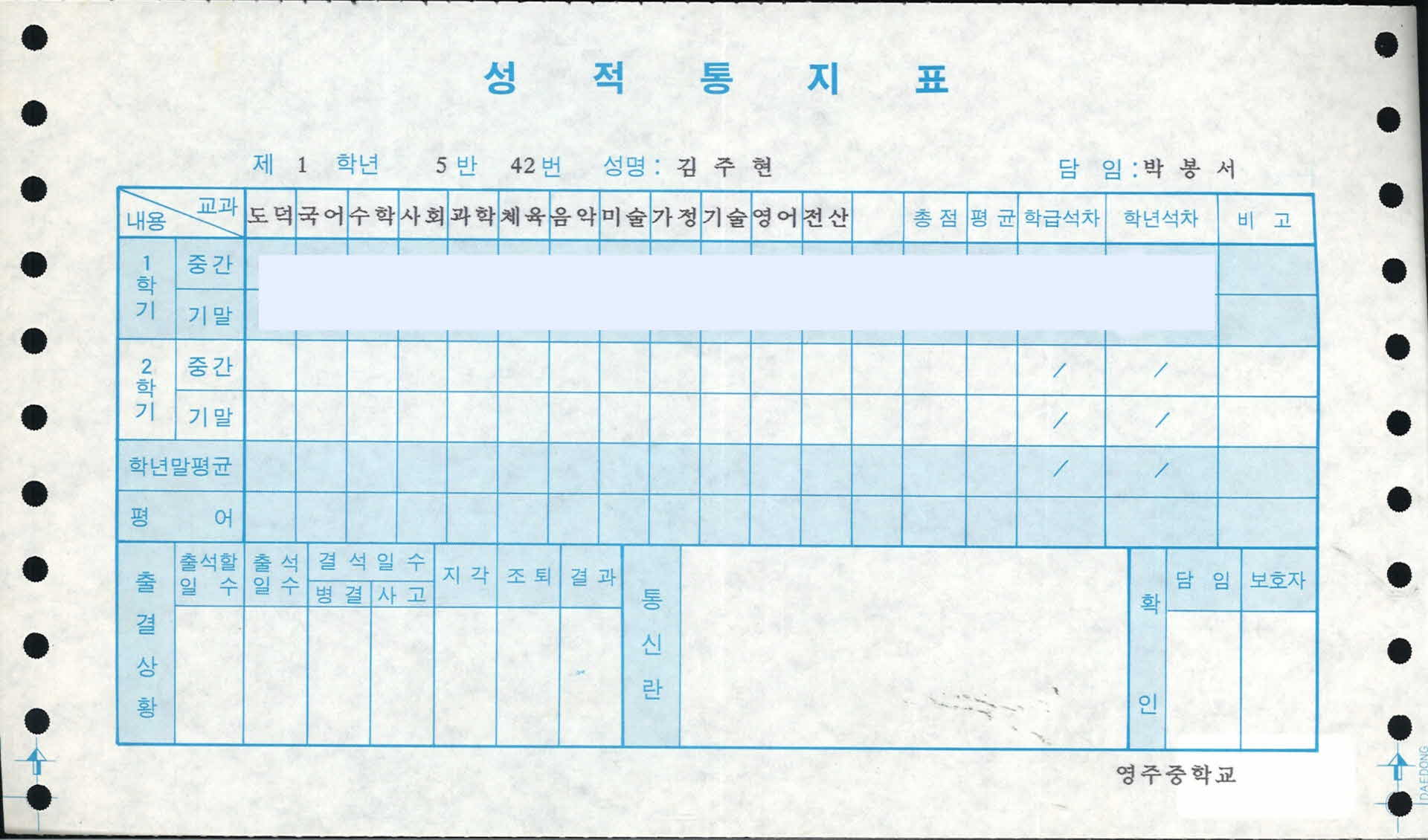 영주중학교 성적통지표