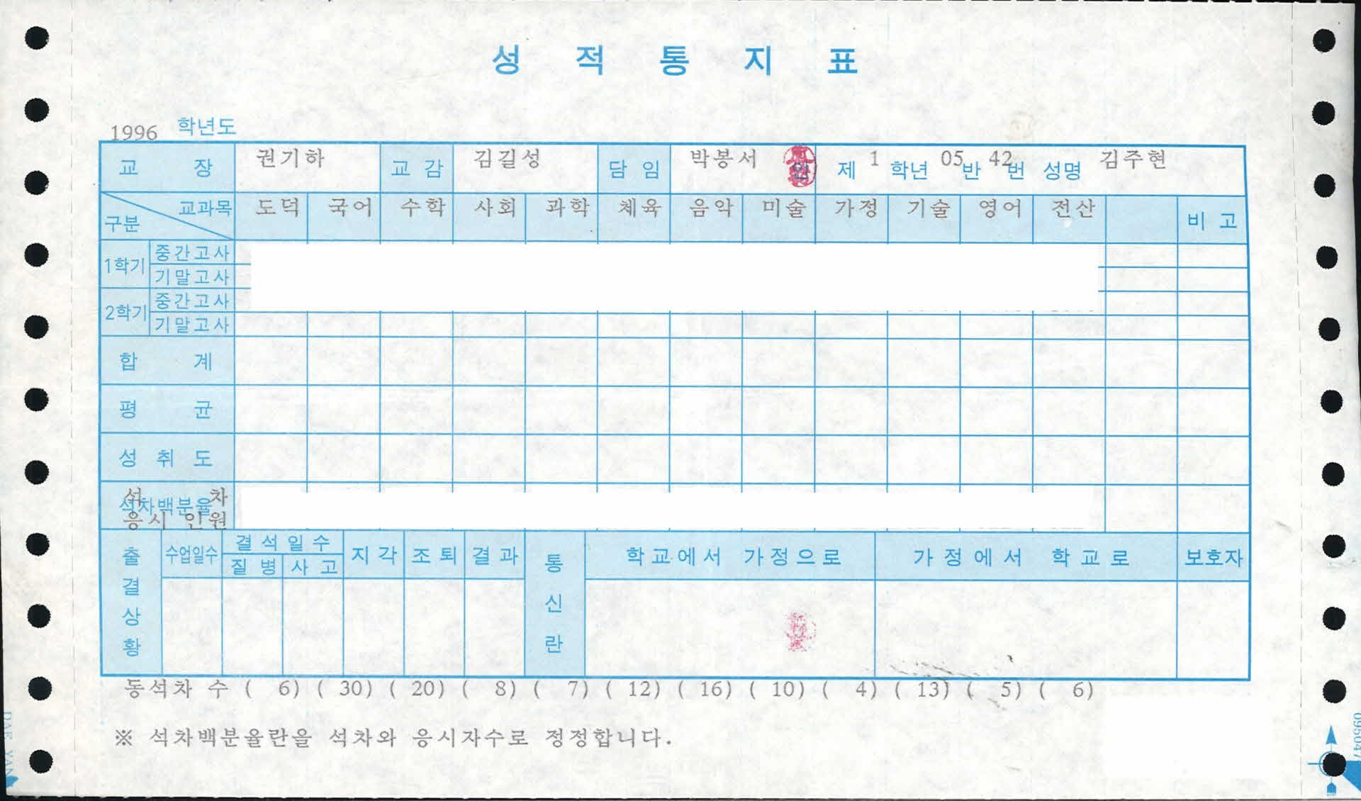| 기록물명 | 1996년 영주중학교 성적통지표 | ||