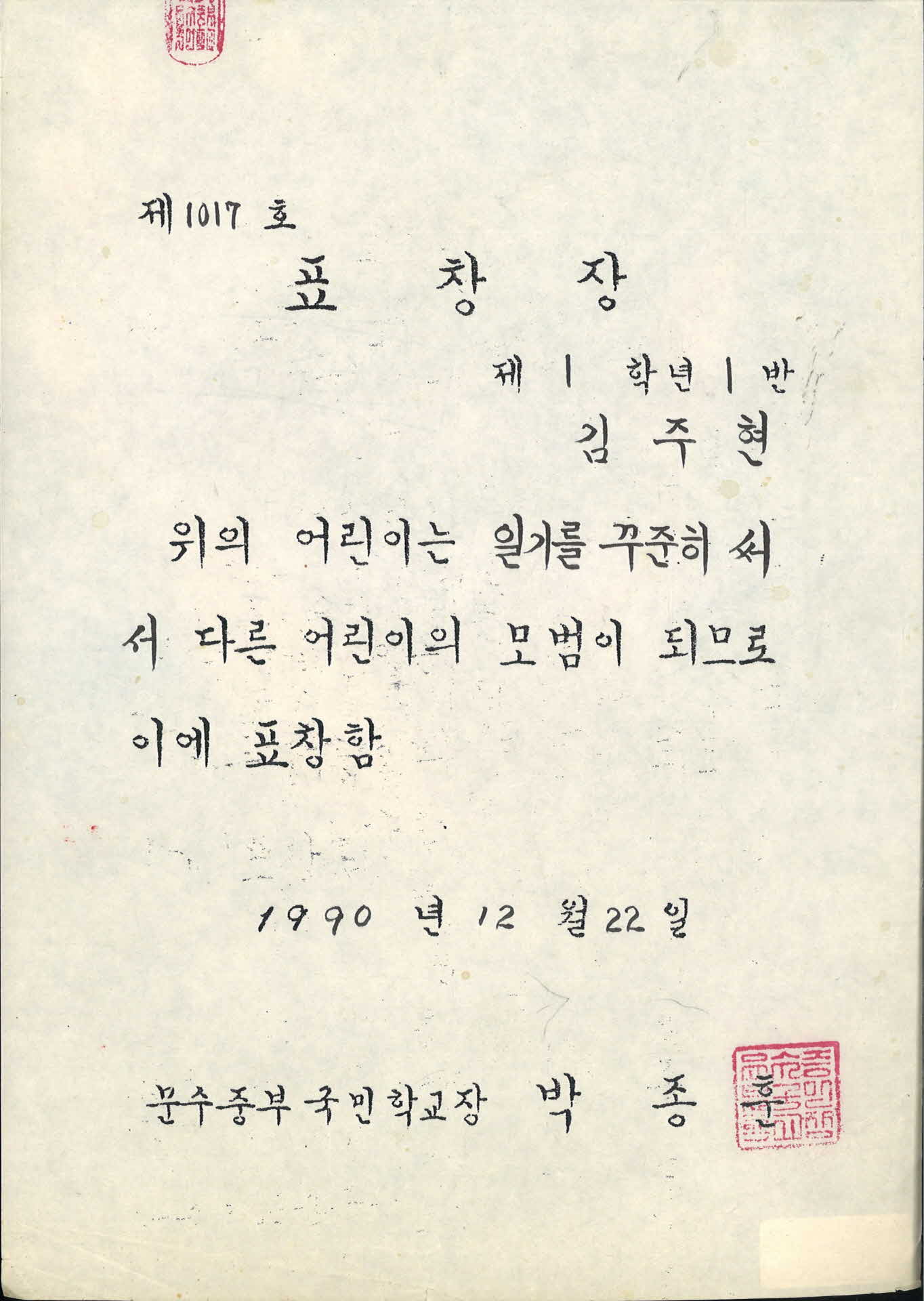 | 기록물명 | 문수중부국민학교 모범 표창장 | ||
