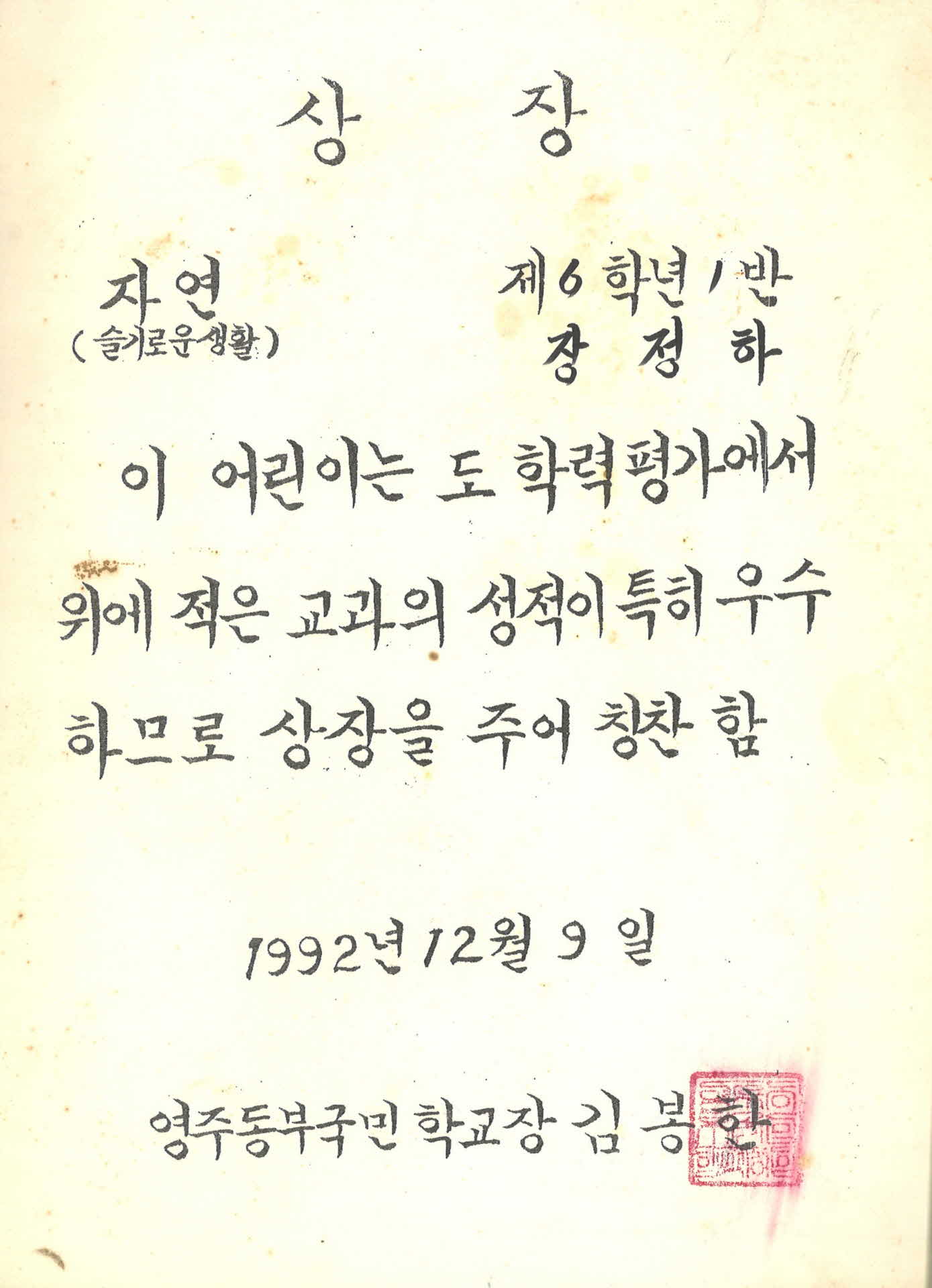 | 기록물명 | 자연(슬기로운생활) 상장 | ||
