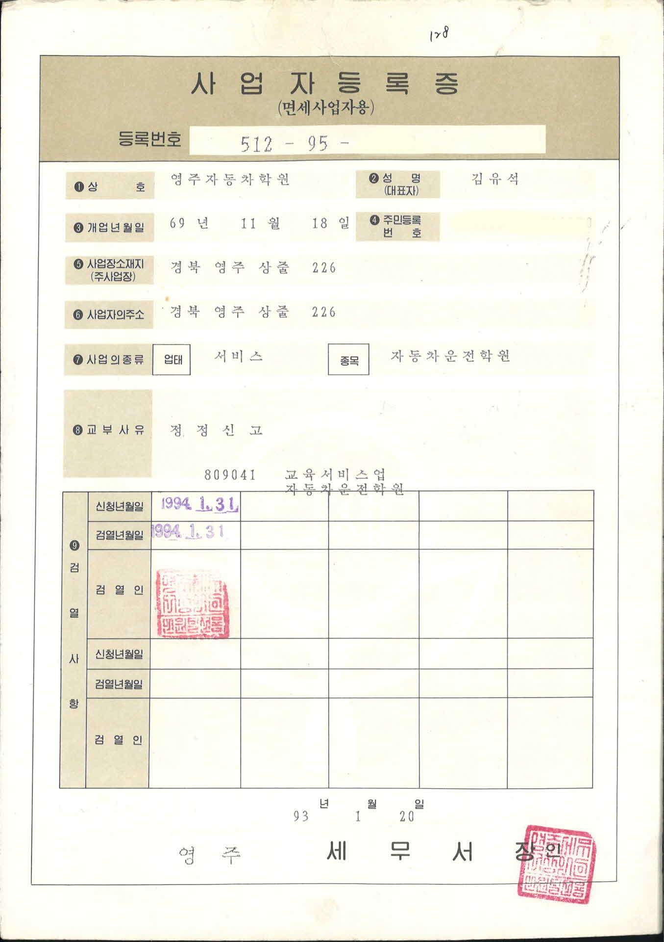 | 기록물명 | 영주자동차학원 사업자등록증 | ||