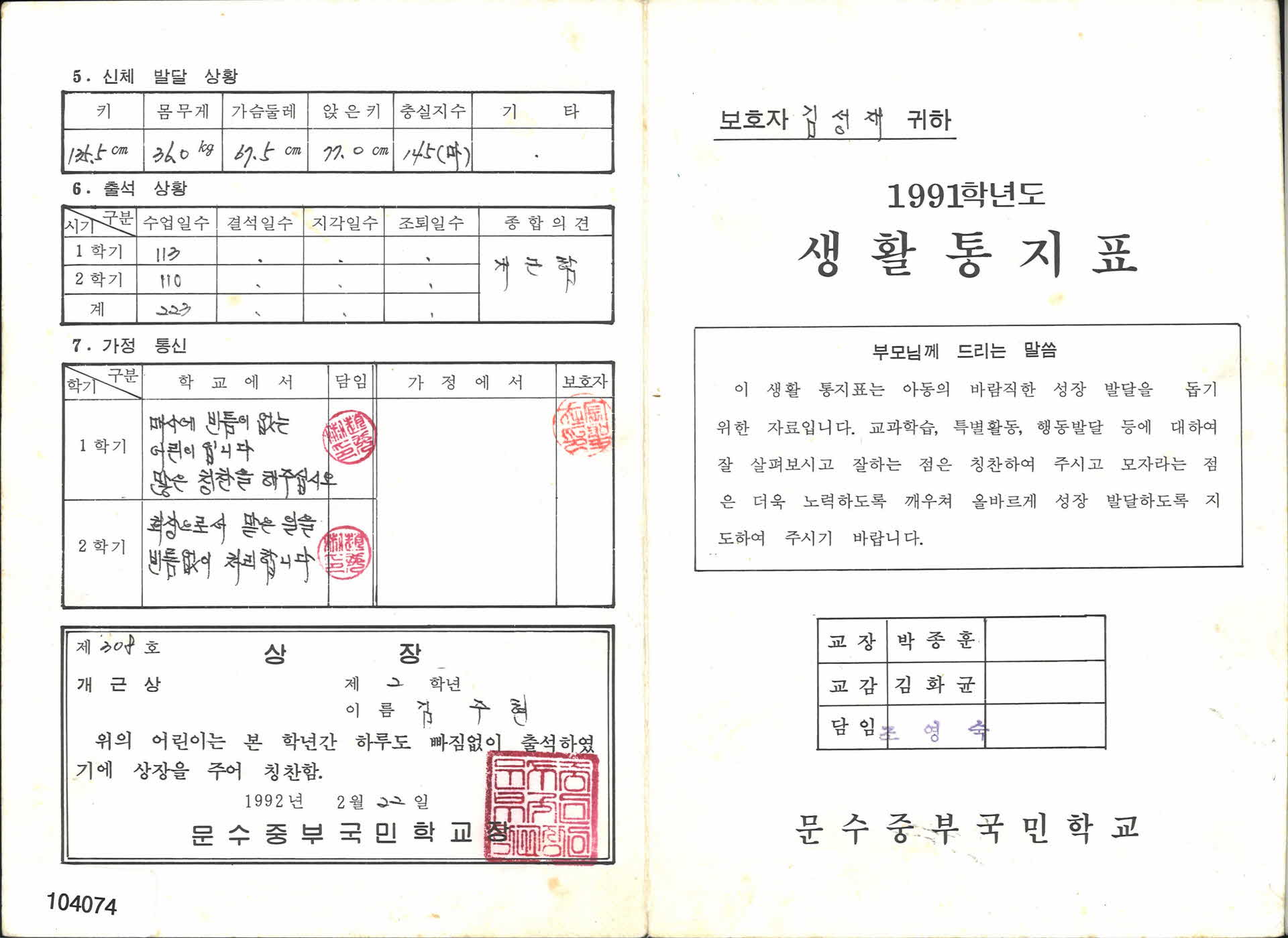 문수중부국민학교 생활통지표