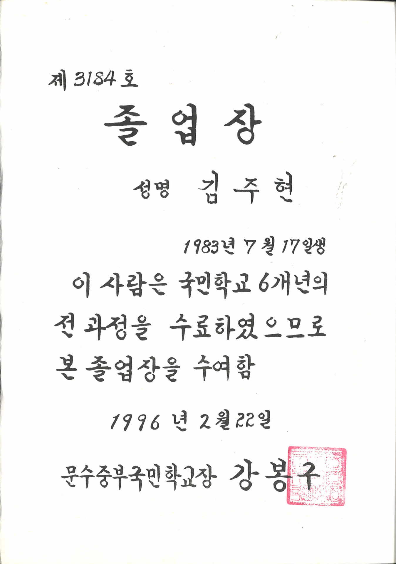 문수중부국민학교 졸업장