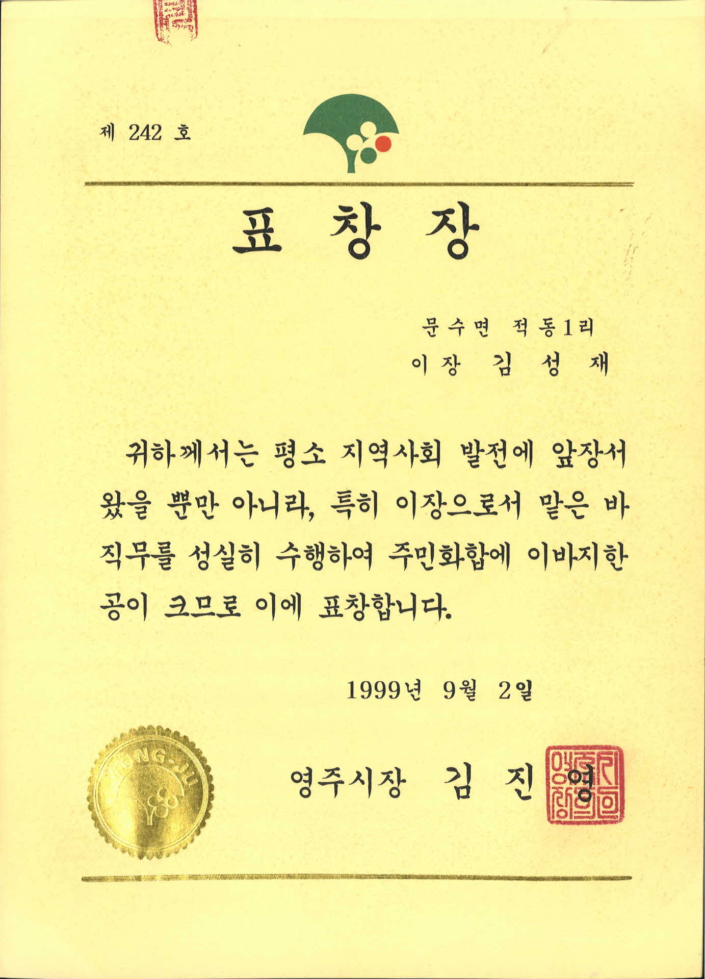 | 기록물명 | 영주시장 표창장 | ||