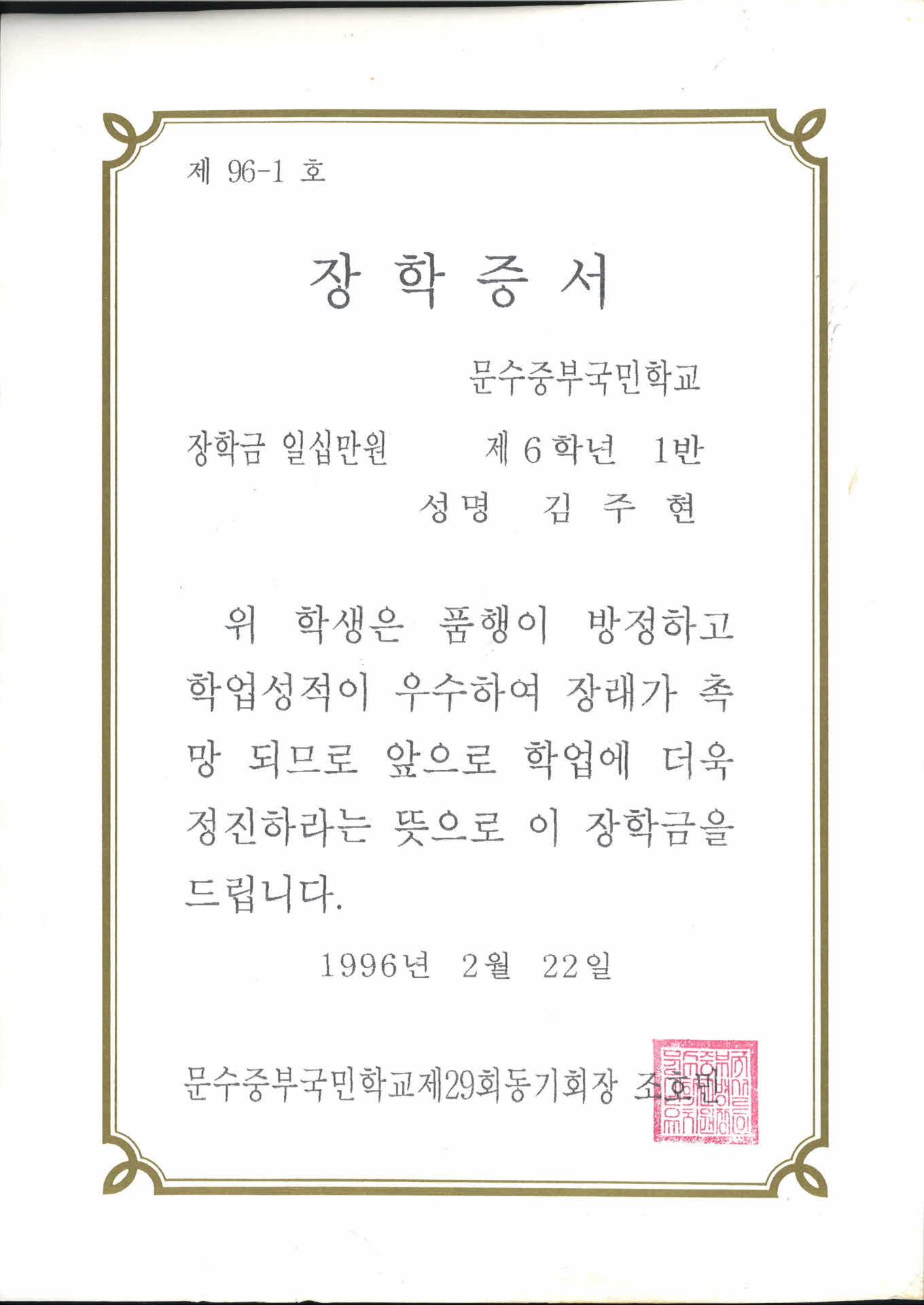 문수중부국민학교 장학증서