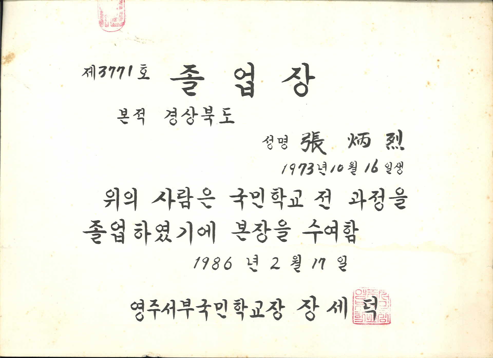 영주서부국민학교 졸업장