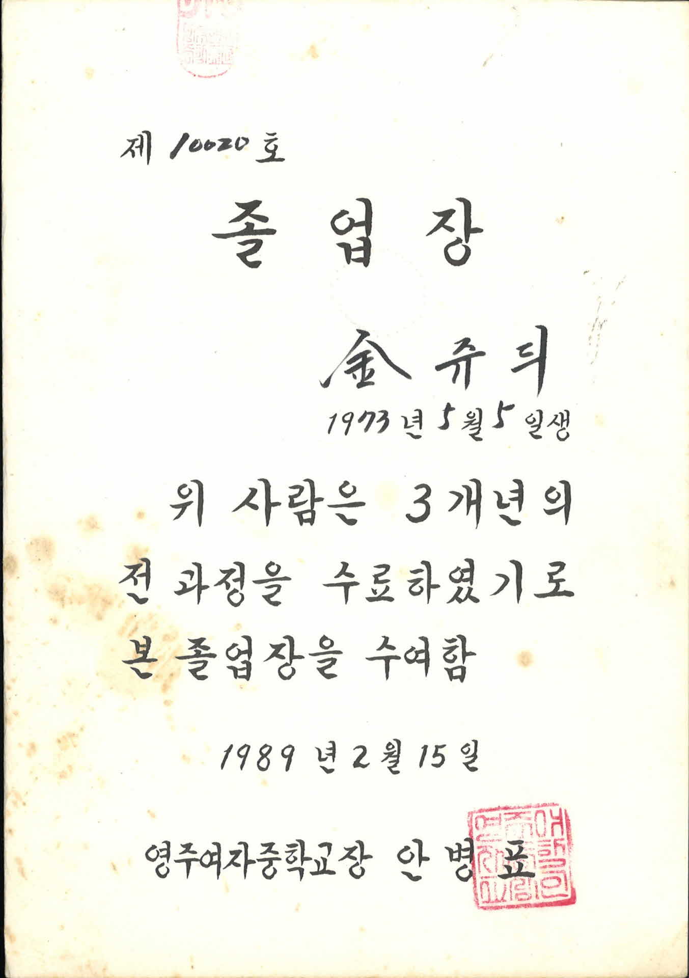 영주여자중학교 졸업장