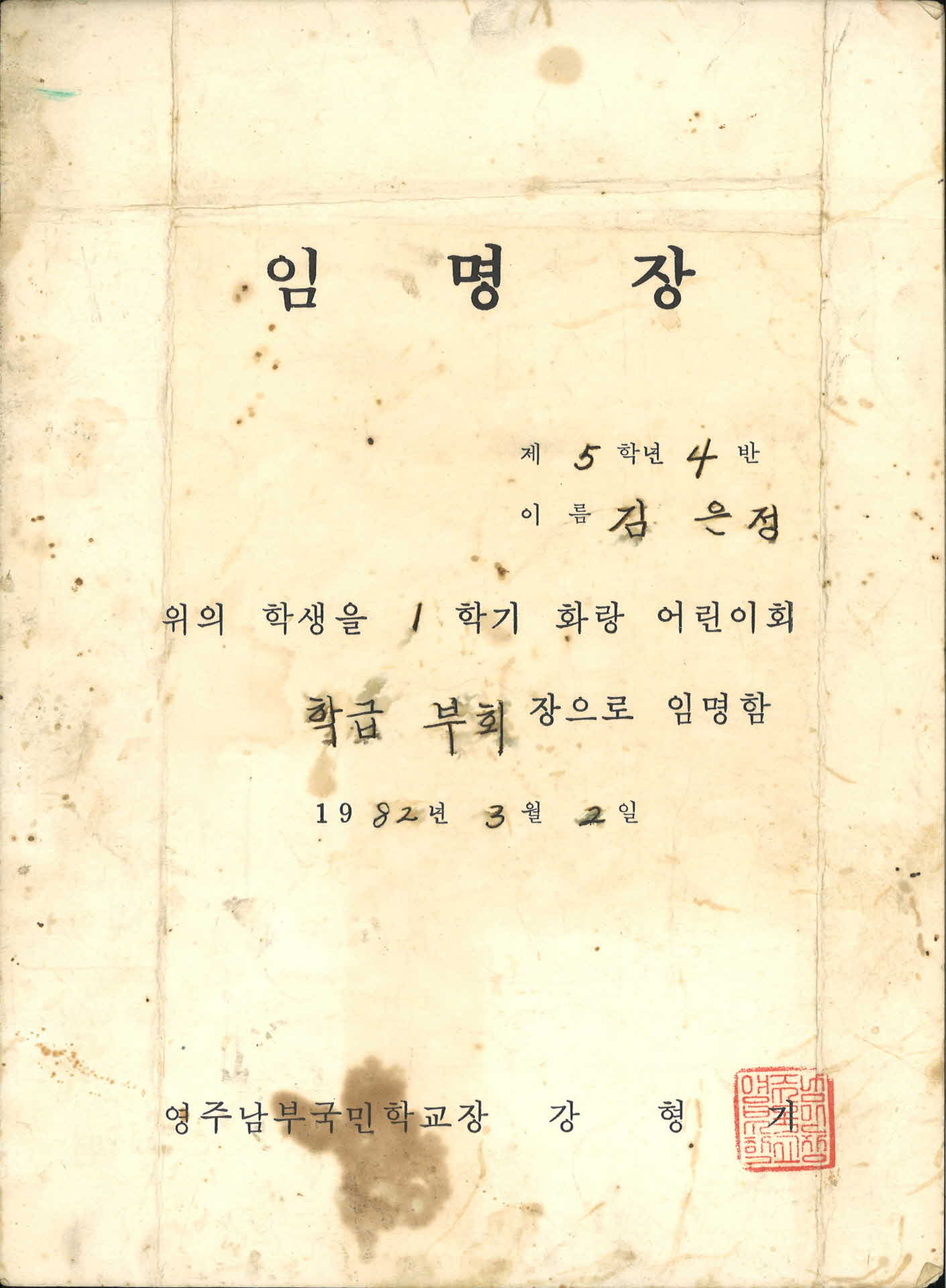 1982년 영주 남부국민학교 임명장