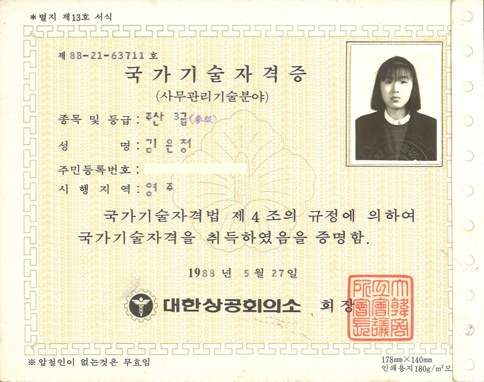 1988년 주산 3급 자격증