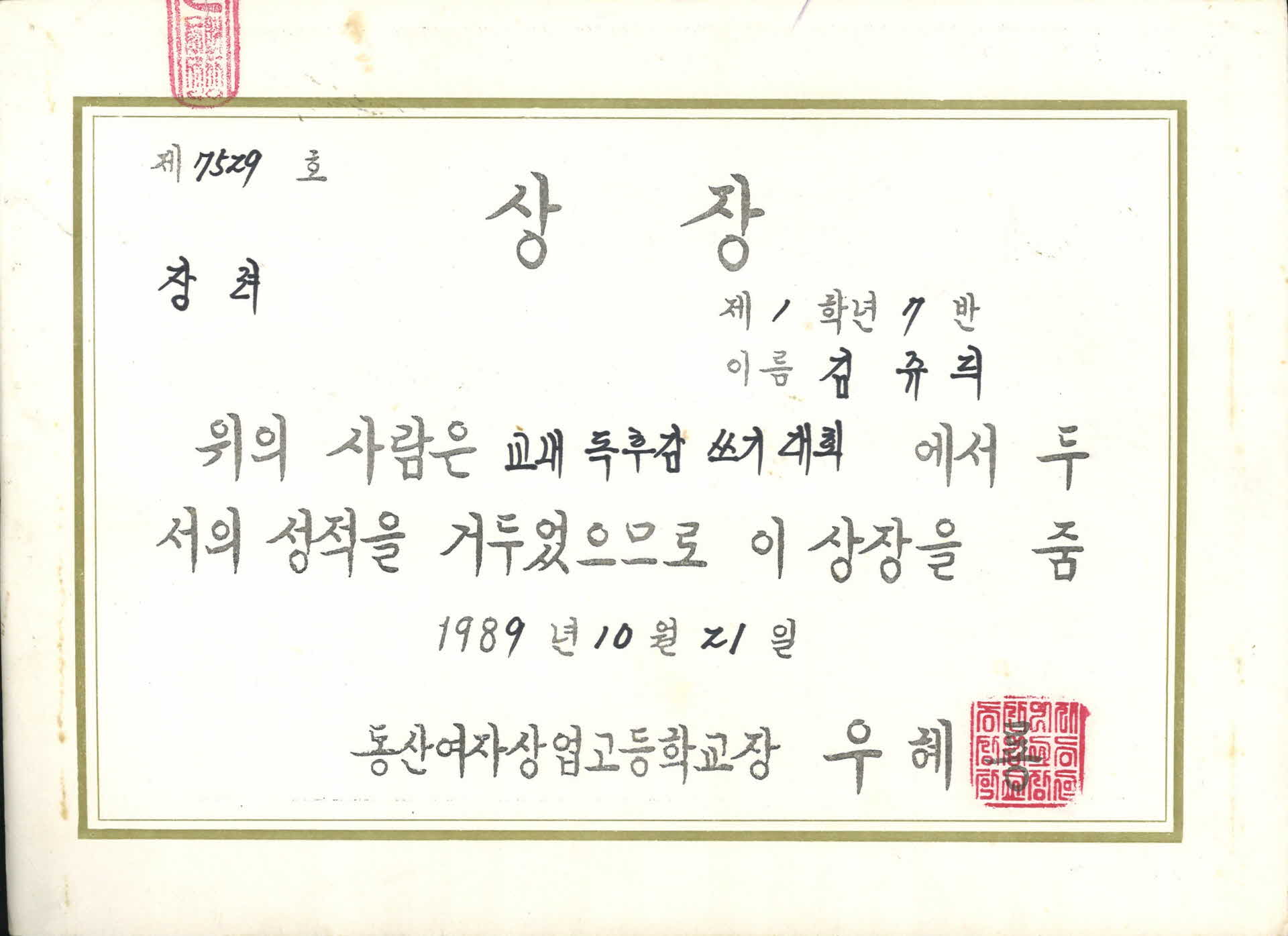 동산여자상업고등학교 교내독후감쓰기대회 상장