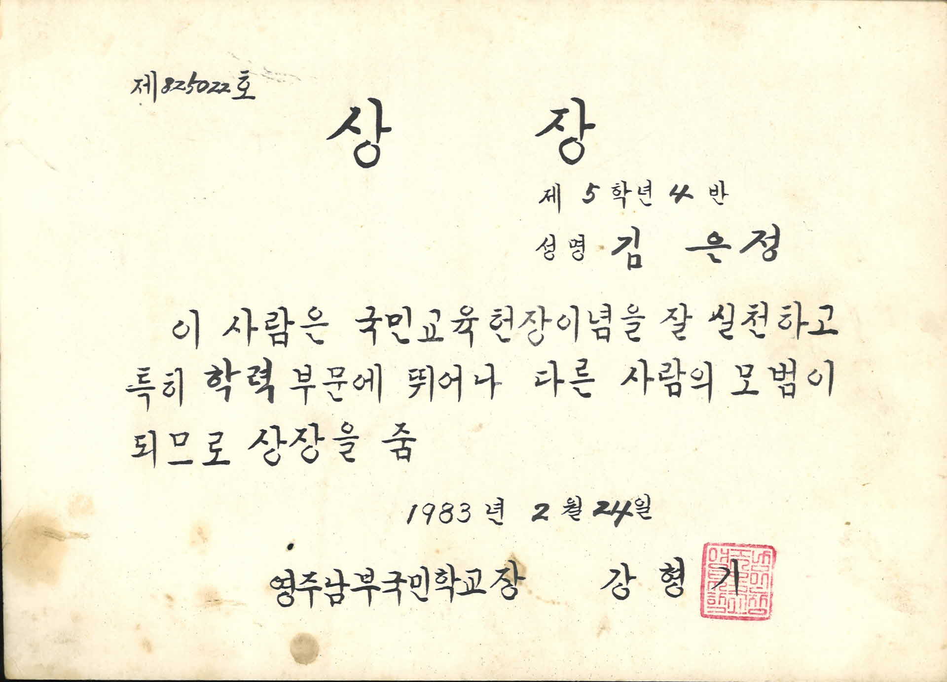 영주남부국민학교 학력우수 상장