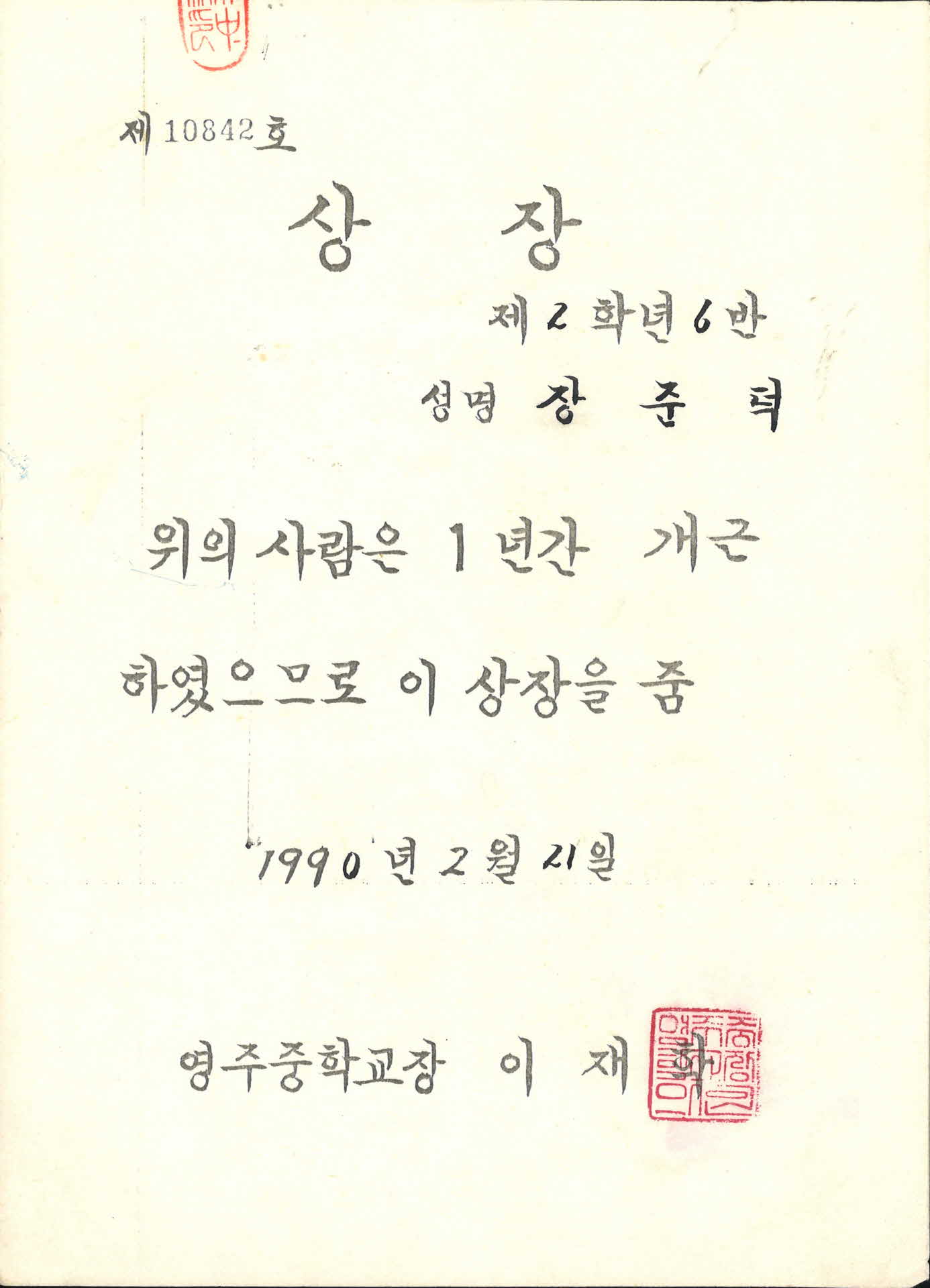 | 기록물명 | 영주중학교 개근 상장 | ||