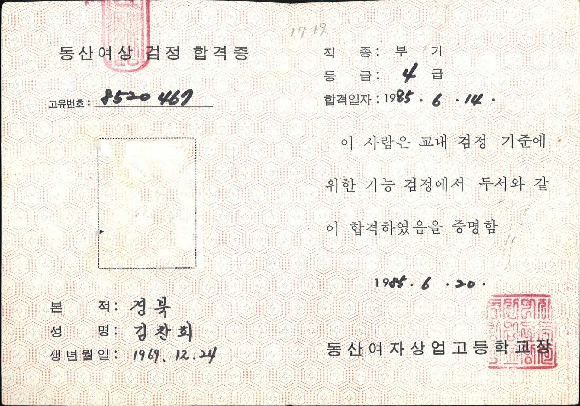 | 기록물명 | 1985년 동산여상 부기 4급 검정 합격증 | ||