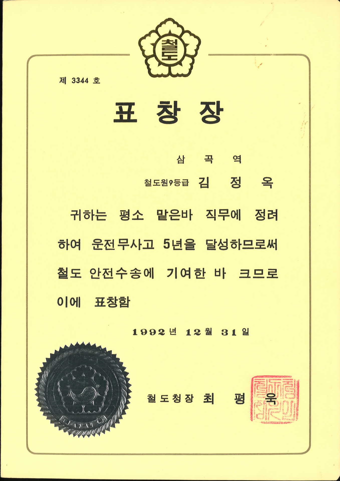 철도청장 표창장