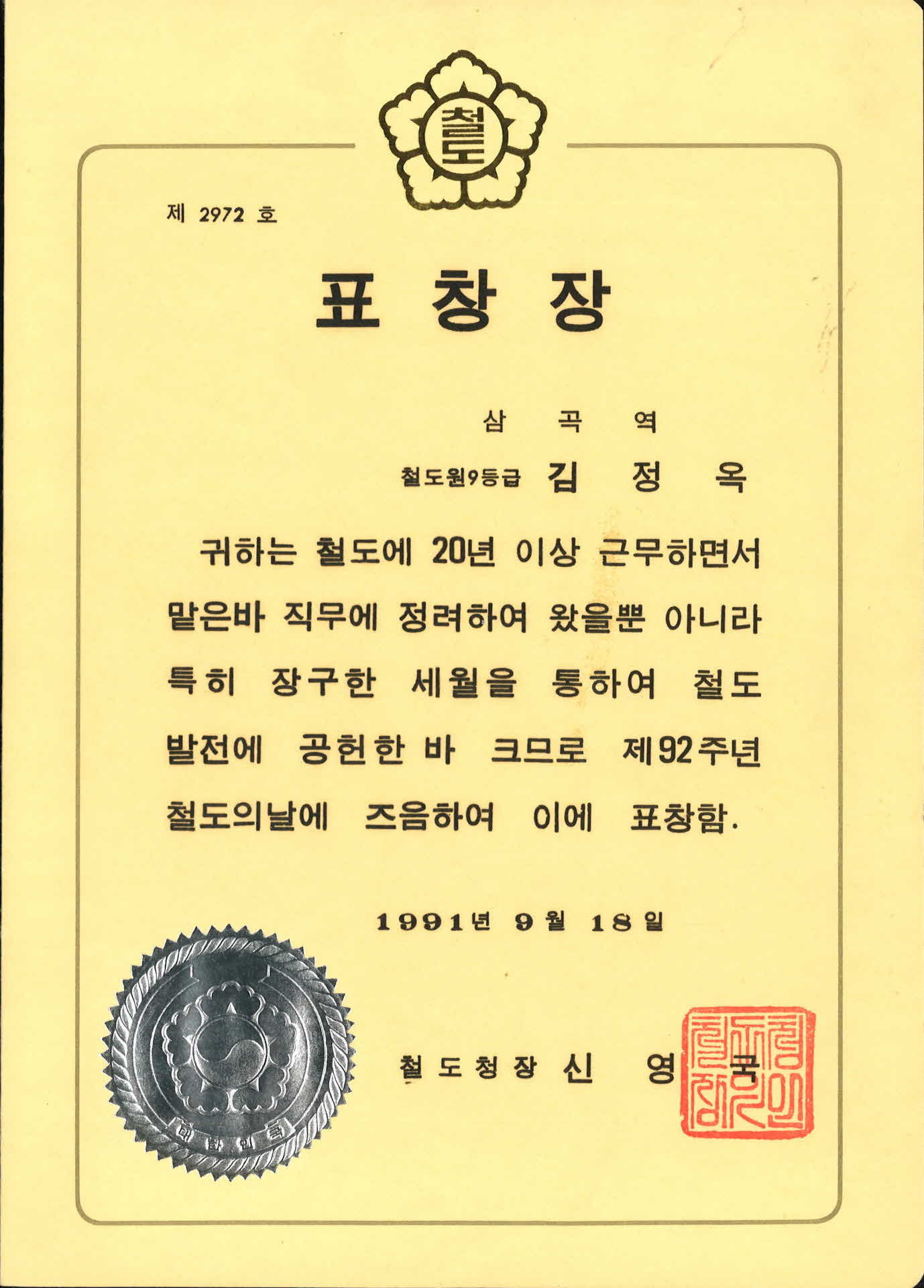 철도청장 표창장