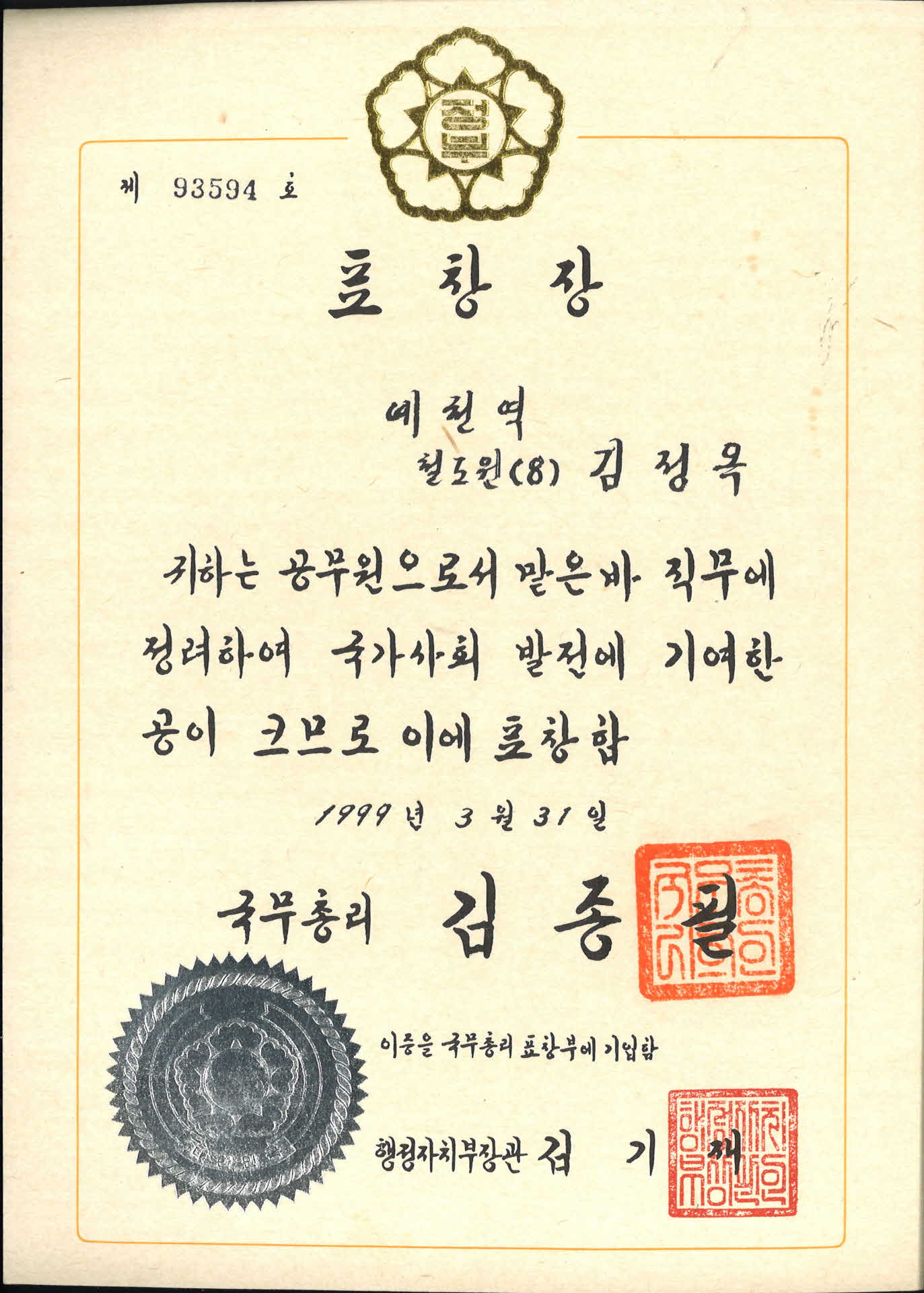1999년 국무총리 표창장