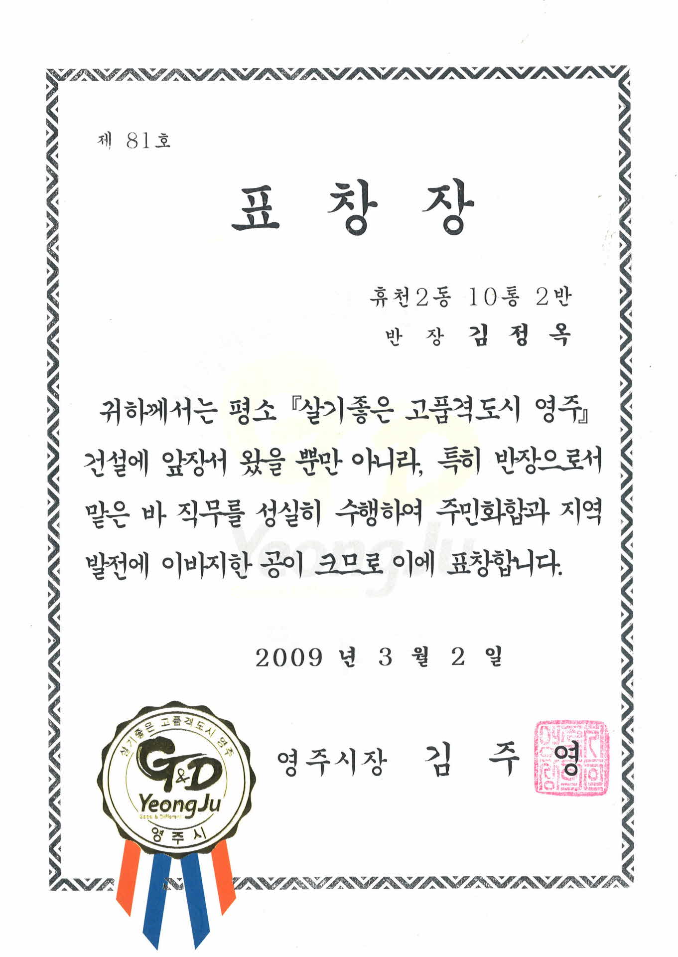 2009년 영주시장 표창장