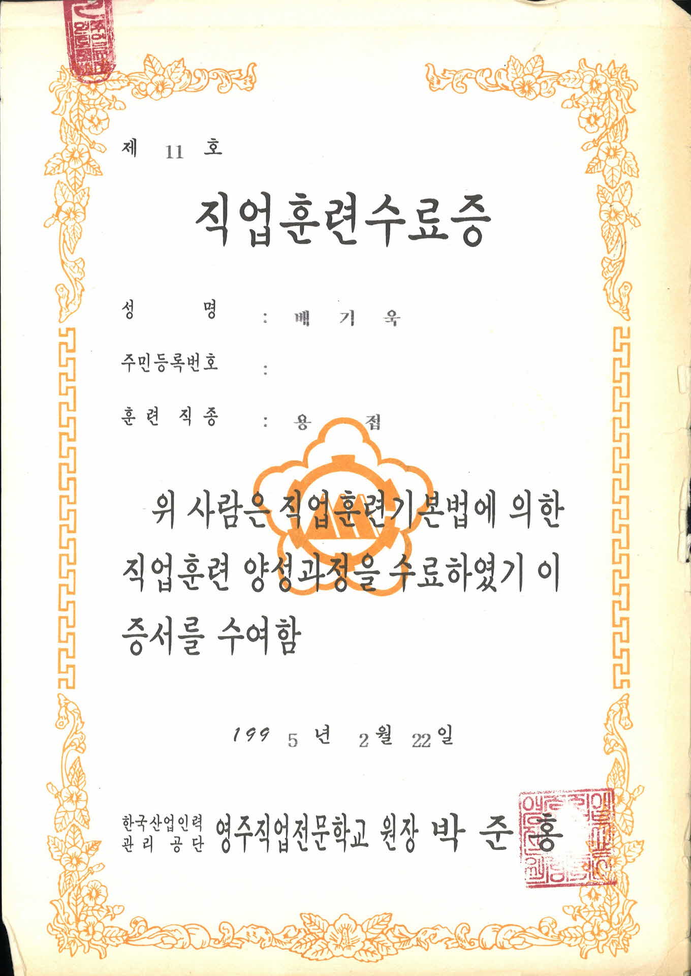 | 기록물명 | 직업훈련수료증(용접) | ||