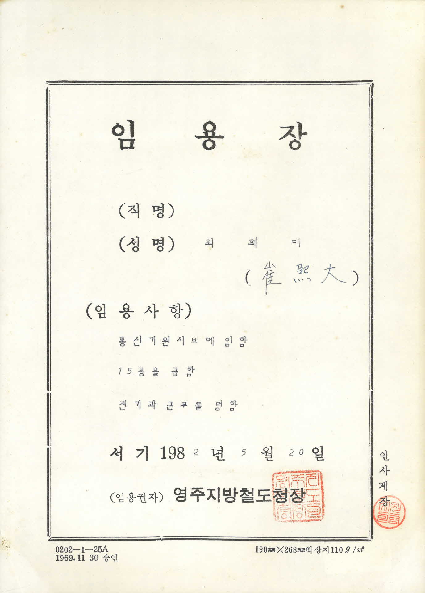 | 기록물명 | 영주지방철도청 임용장 | ||