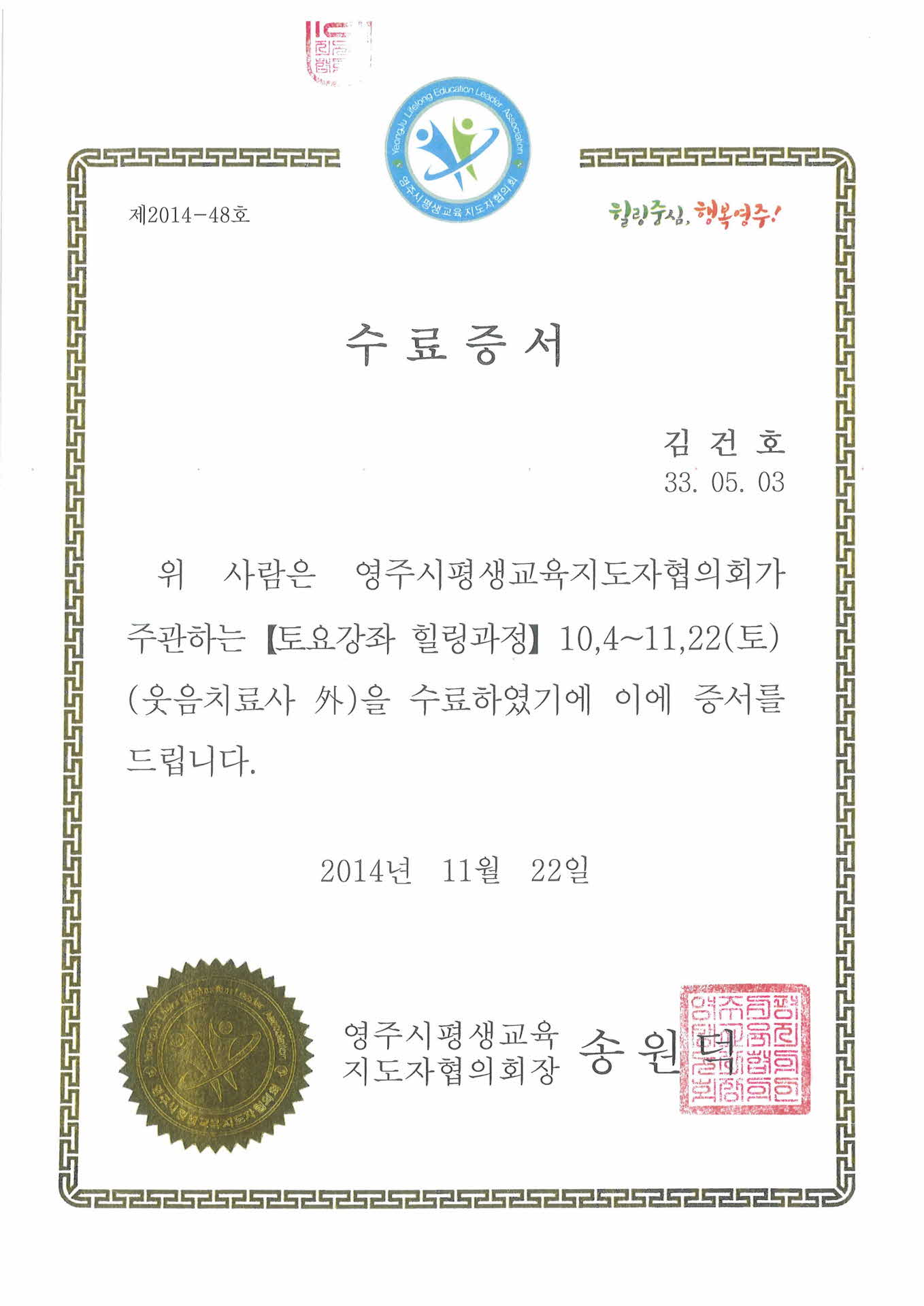 토요강좌 힐링과정 수료증서-사본