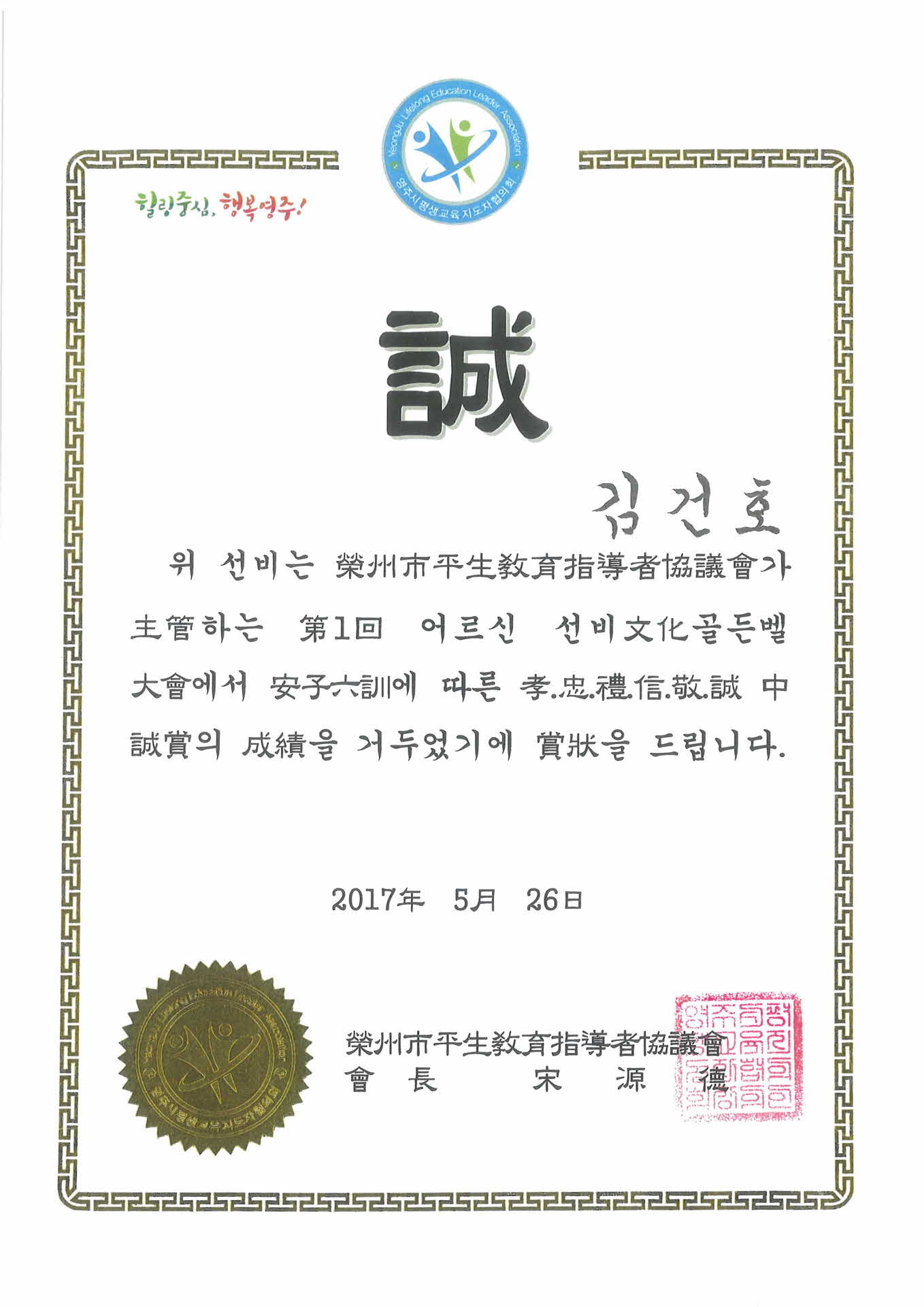 | 기록물명 | 2017년 제1회 어르신 선비문화골든벨대회 상장-사본 | ||