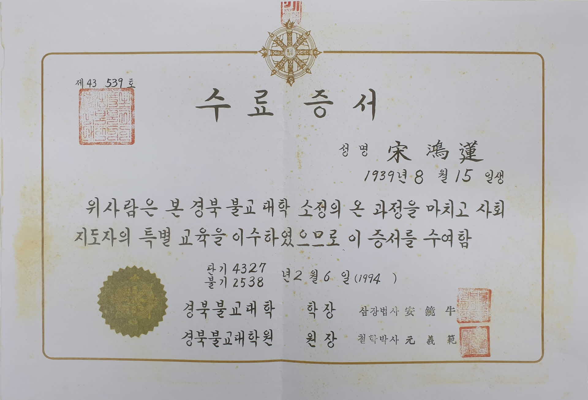 | 기록물명 | 제43 539호 수료증서-사본 | ||