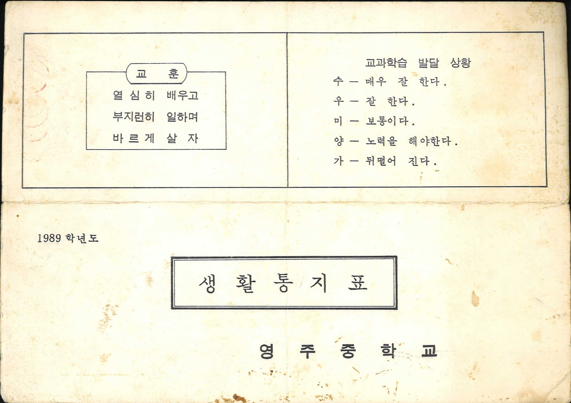 1989년 영주중학교 생활통지표
