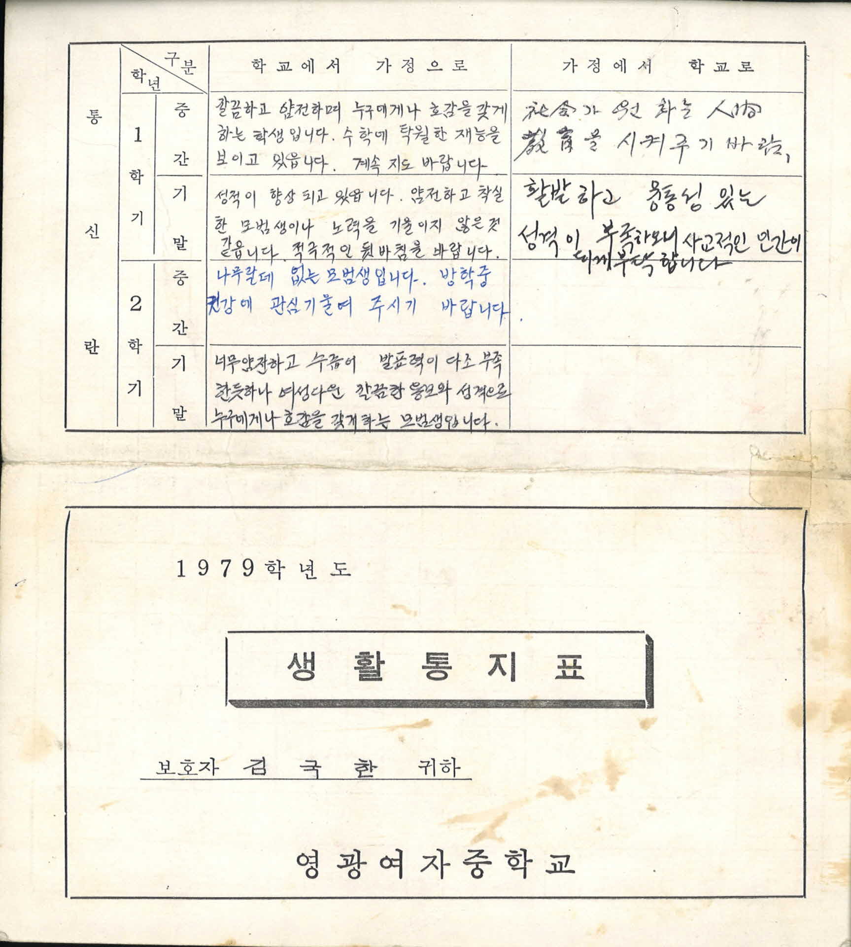 1979년 영광여자중학교 생활통지표