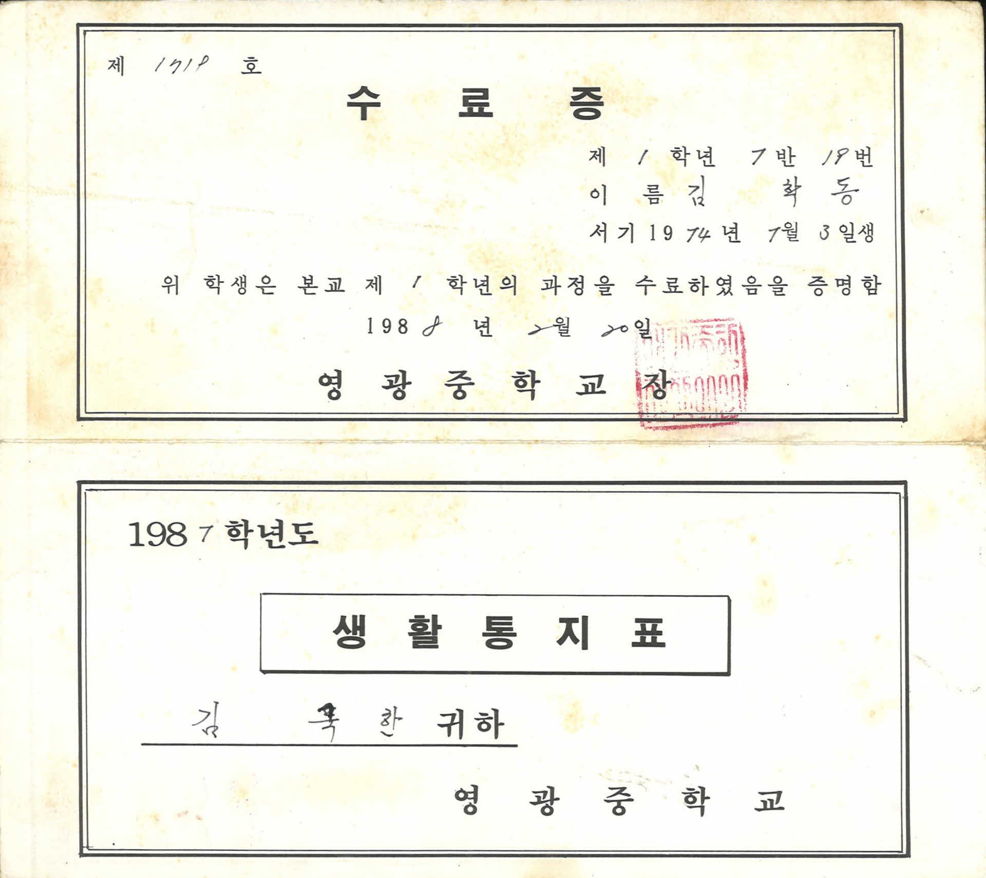 | 기록물명 | 1987년 영광중학교 생활통지표 | ||
