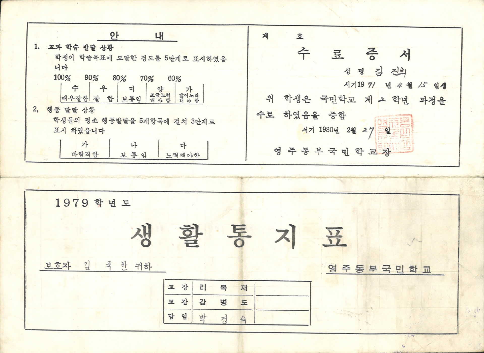 1979년 영주동부국민학교 생활통지표