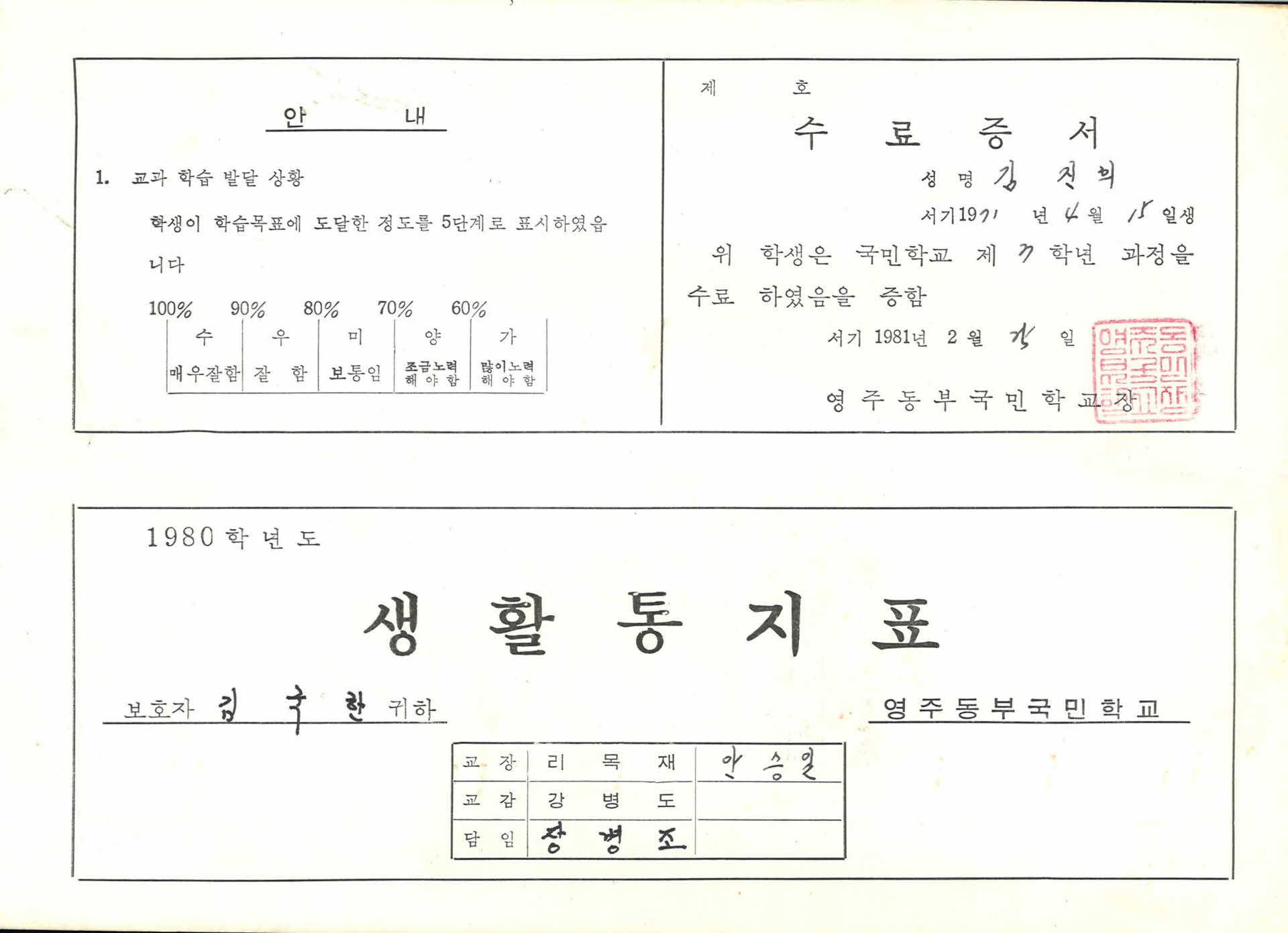 1980년 영주동부국민학교 생활통지표