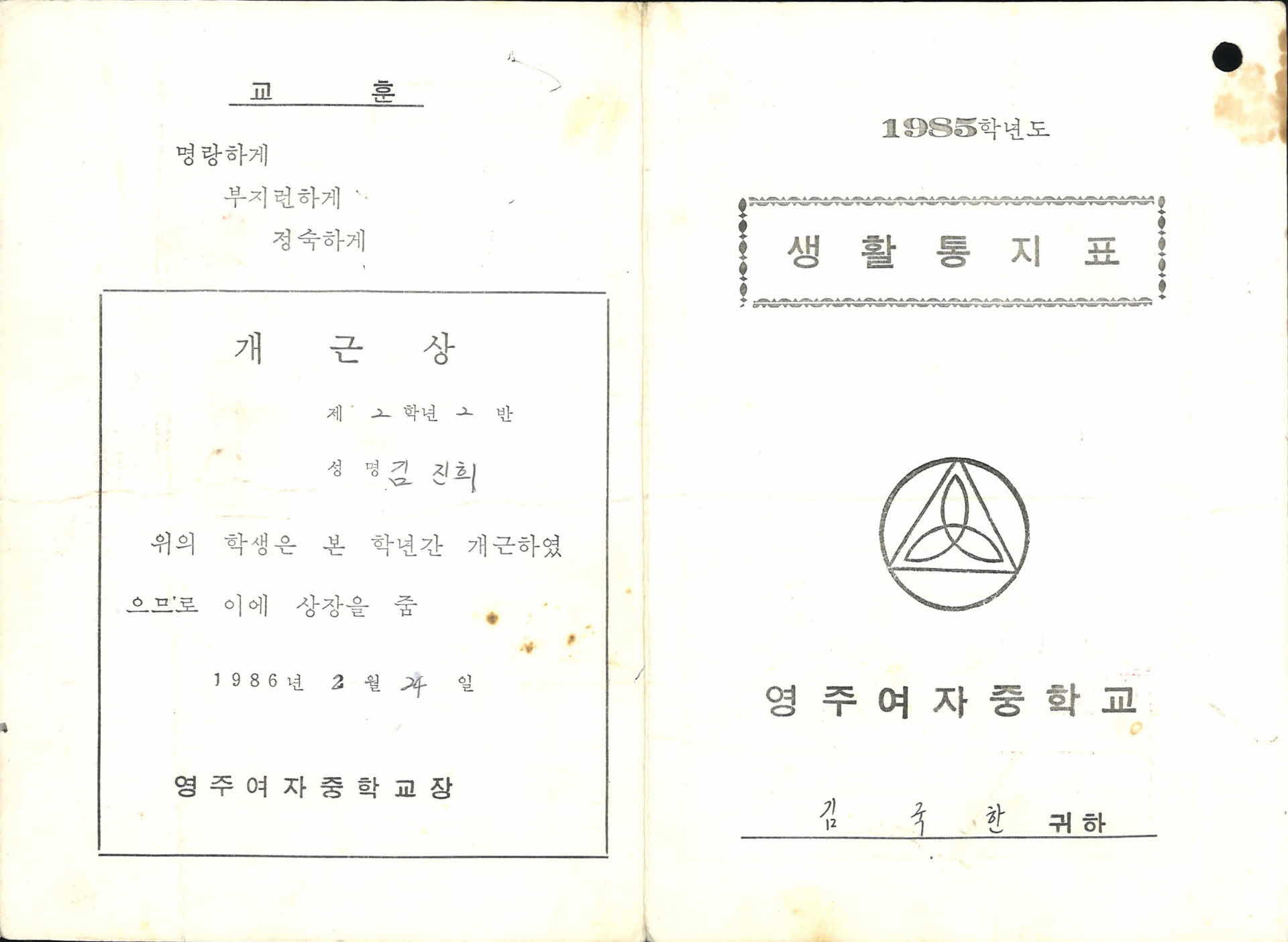 1985년 영주여자중학교 생활통지표