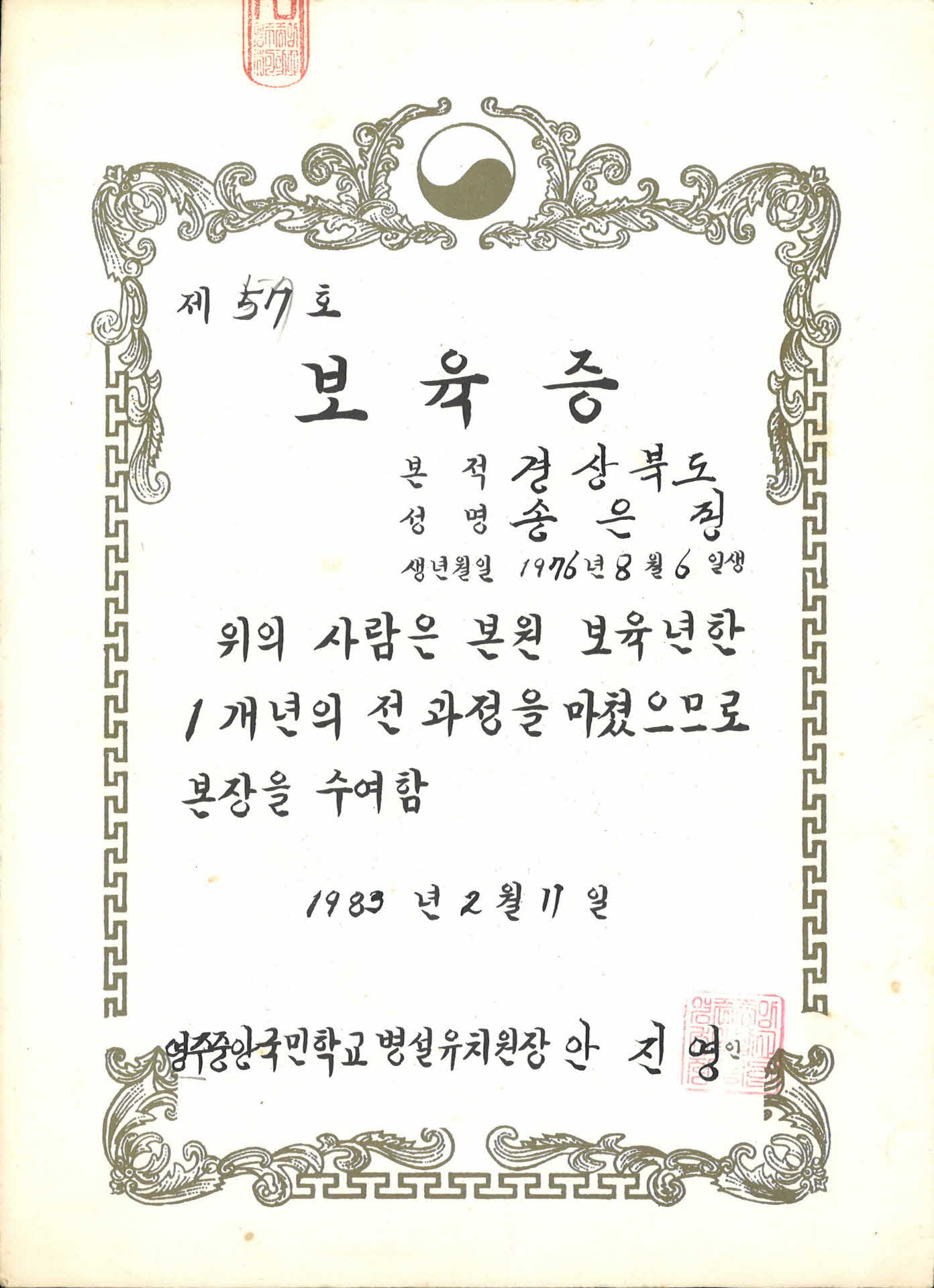 | 기록물명 | 1983년 영주중앙국교병설유치원 보육증 | ||